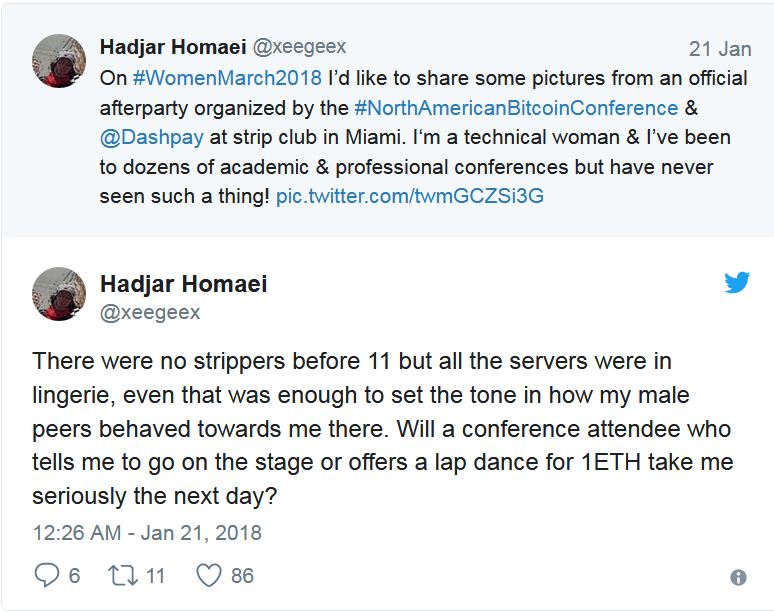 Referring to news on Business Insider, last month a North American Cryptocurrency conference for networking event was held in Miami where the attendees after the conference attended the nude strip club performances. Obviously the event was male dominated which made female attendees to leave the premises as they started feeling uncomfortable. Even the host of the event realized that holding the event in Miami Strip Club was a blunder mistake which should not have happened for a business conference. It too reflects the condition of the society we are living in that even like other businesses or cultures, the surroundings in Cryptocurrency sphere is also influenced by males and we don’t resist from such activities to make our female colleagues and coworkers uncomfortable. Few women from the event used their twitter handle to share their opinions as below!