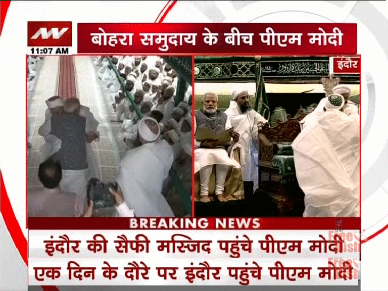 Indian prime minister has visited first time to Bohra Community today. It seems like now he is trying to give harmony gestures to all communities, but it's not so easy path. In Bohra Community prime minister has given the speech and said everyone is joining Swachh bharat. Most of his schemes are failed but he still hope with this scheme of cleanliness movement. Narendra Modi says that 90% people has toilet facilities. This facilities are provided by his efforts. In Narendra Modi has visited at Safi Majzid and attend the program. In Bohra community, the 53th Dharmguru day is celebrate today. Only one tour in Indoor, of prime minister. In speech of Narendra Modi says I'm proud of my history. Prime Minister says that Swachh Bharat mission is on number one.