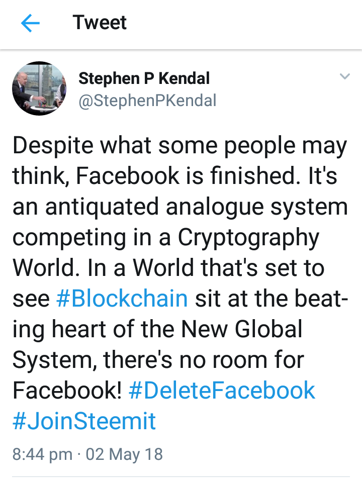 Despite what some people may think, Facebook is finished. It's an antiquated analogue system competing in a Cryptography World. In a World that's set to see #Blockchain sit at the beating heart of the New Global System, there's no room for Facebook! #DeleteFacebook #JoinSteemit