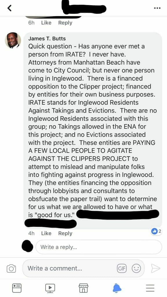 Mayor James Butts repeatedly launches public attacks on his opposition similar to this one, posted to Facebook in early March.As recently as the morning of March 9, 2018, he posted on comment on Facebook asserting, “there is a financed opposition to the Clipper project” that is “PAYING A FEW LOCAL PEOPLE TO AGITATE AGAINST [IT]” (caps not mine). In that comment, he specifically called out Inglewood Residents Against Takings and Evictions (IRATE), who sued the City in July 2017 to stop the arena project.