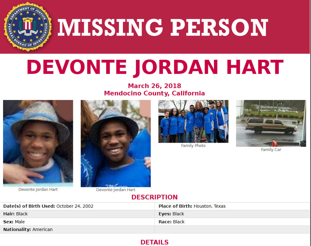 On March 26, the two women were found dead in their SUV at the base of the cliff-side with three of their adopted children, Markis, age 19, Abigail, age 14, and Jeremiah, age 14. Originally, California Highway patrol believed all the children were in the vehicle at the time of the wreck. A fourth body was recovered weeks after the crash and the DNA report has confirmed the body to be of Sierra Hart.The other two children who are missing are Devonte, age 15, and Hannah, age 16. After several weeks, the FBI has officially released missing person alerts for Devonte and Hannah.