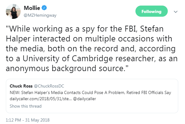 Worse, Halper interacted with sources in the press during this time, providing anonymously-sourced information to lend credibility to the baseless Russia collusion investigation being used to sabotage Trump. Beyond Halper’s placement as a spy, these on and off-the record media liaisons raise damning red flags regarding the consequences and impropriety of an FBI agent making independent — and subversive — disclosures to the media. According to retired FBI investigator James Gagliano, such an operation is “highly irregular,” and “not something that [he] would have ever tolerated with any of the folks working for me.”