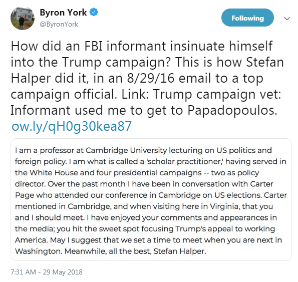Obama’s administration took the historic and egregious step of recruiting Halper, a national security academic, to spy on Trump associates during the campaign by striking up what seemed to be innocent professional contacts. Serving as a “confidential human source,” an official category of spy that is regulated by the FBI’s domestic investigations directive, Halper was placed in Trump’s campaign as part of Obama’s broader scheme to favor Clinton to succeed him, in direct conflict with the FBI’s rulebook that encourages alternatives to human spies in any investigation, particularly in one involving an election-year political campaign.