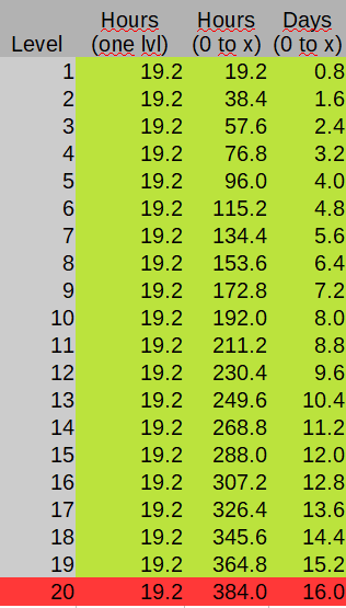 Each upgrade level takes at least 19.2 hours. Therefore, 20 levels require at least 16 days (384h).