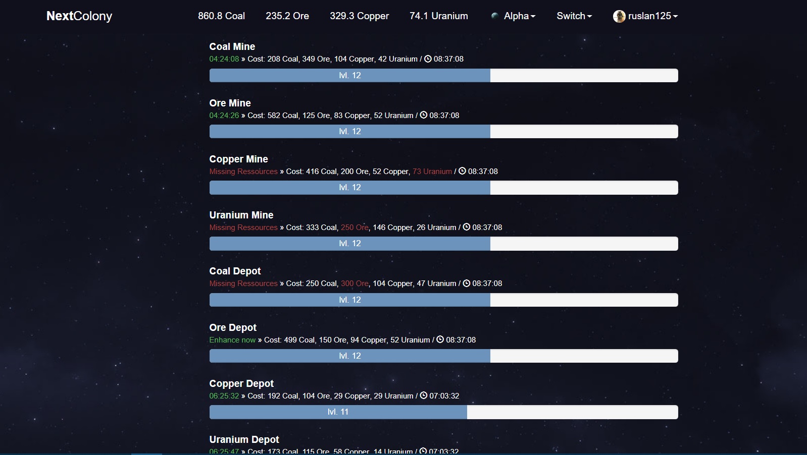 Вот моя прокачка по большинству навыков. Начиная с двенадцатого уровня требование к ресурсам растет в геометрической прогрессии. По-началу я планировал прокачать еще парочку левелов, но затем забил на это дело. Не выгодно. По-моему с моим мнением солидарны большинство других игроков.