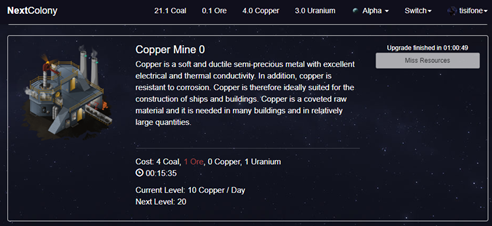 In addition to investing in the shield generator, which as I read in another publication, is a recent addition to the game, I am left with some resources to start working on the buildings, being today's lucky copper mine. I hope to level up my planet's abilities quickly so that I can soon be exploring the next colonies of this vast universe that steem offers us.