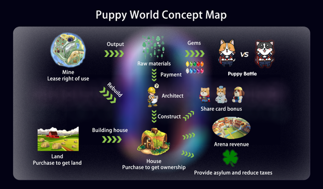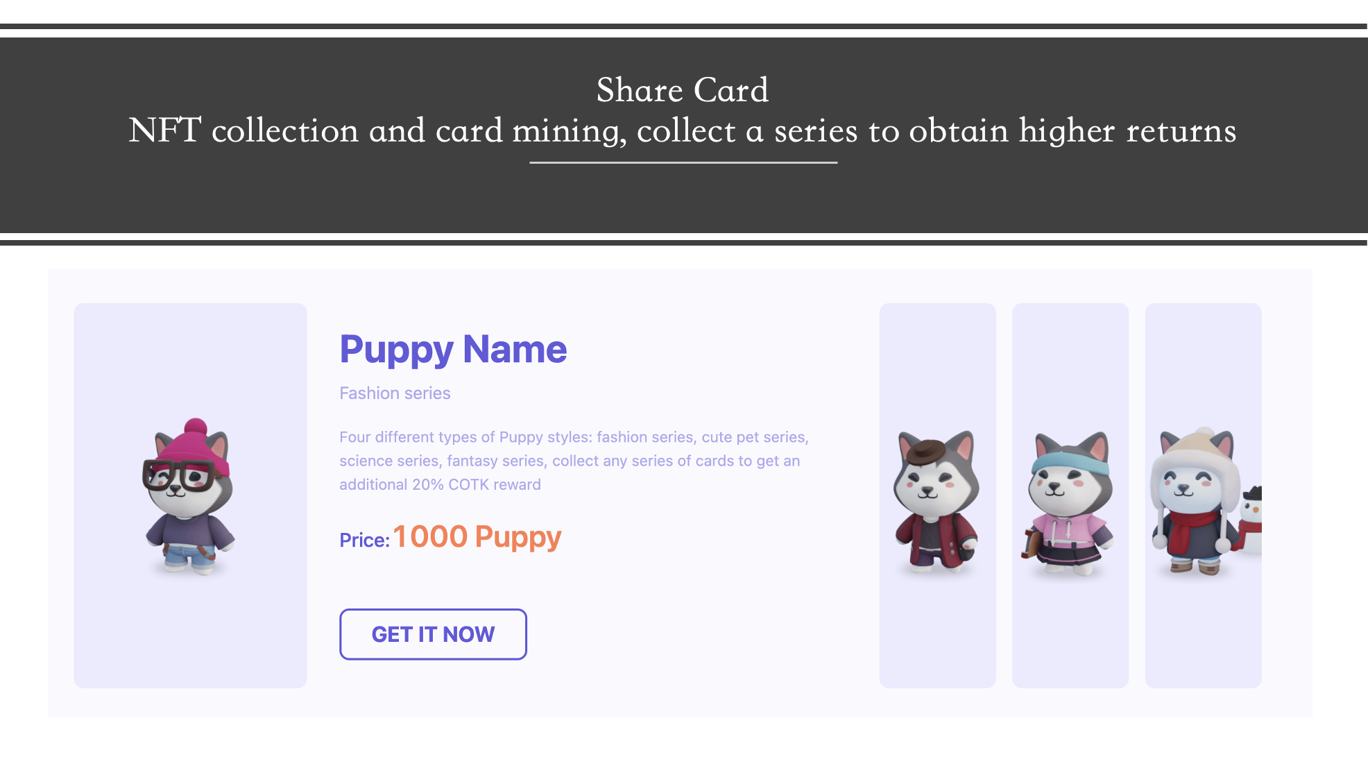 Co-Puppy is a fascinating NFT architecture that includes cute NFTs, fighting, funding, valuation, gamefi, and the metaverse. In Co-Puppy, users may explore a universe where they can maximise their profits in a number of ways. As is generally recognised today, many NFT systems merely provide a marketplace and do not provide other services to meet the demands of a diverse user base. Regardless of the fact that not all NFT participants produce or gather material, they may opt to generate passive income by becoming stakeholders or lending to other users.