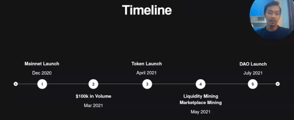 The timeline, we have the main app launch on December 2020 harder than that in volumes on last month, on March 31 and exciting news launch will be a Very soon, signal on April 2021 We have liquidity mining market was mining for next month, and they'll launch on July 2021. The token allocation. Most will go to the community, and the rest will go to the team and investors.
