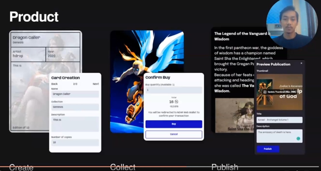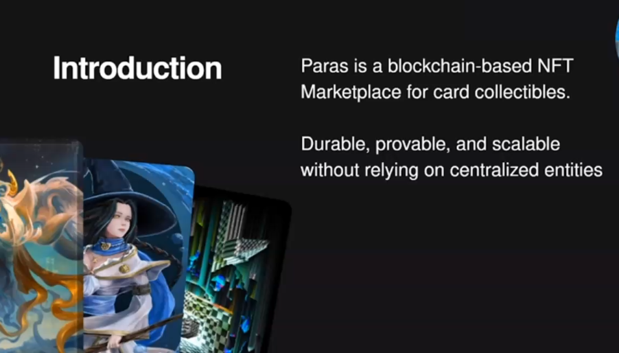 Paras is a blockchain based NFT marketplace for collectibles, we use Near protocol, IPFS and file coin to make sure a durable profitable and scalable NFT ecosystem we are relying on centralised entities. The product that we have right now we have an easy way for our artists and creators to create and maintain NF Ts, we have the Collect feature in which enables our buyers, our users to pretty much buy and sell the NF t's on the marketplace right now. And the last one is the publishing feature that enables our artists and creators to create more depth to their nfdc to their records by giving more story by giving more lore, or by giving some behind the scene story about collections. So the collectors are not only getting the visual aesthetic, but also the story behind it. We believe the story sells.