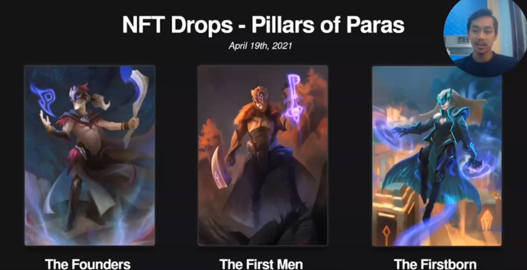 And last is the most exciting news that we can share with you guys NFT drops. We have three cards, the founders, the First Men and the first bonds. They are all from connection pillars of Paras. And these three cards are having a very important role in building the world of Paras.