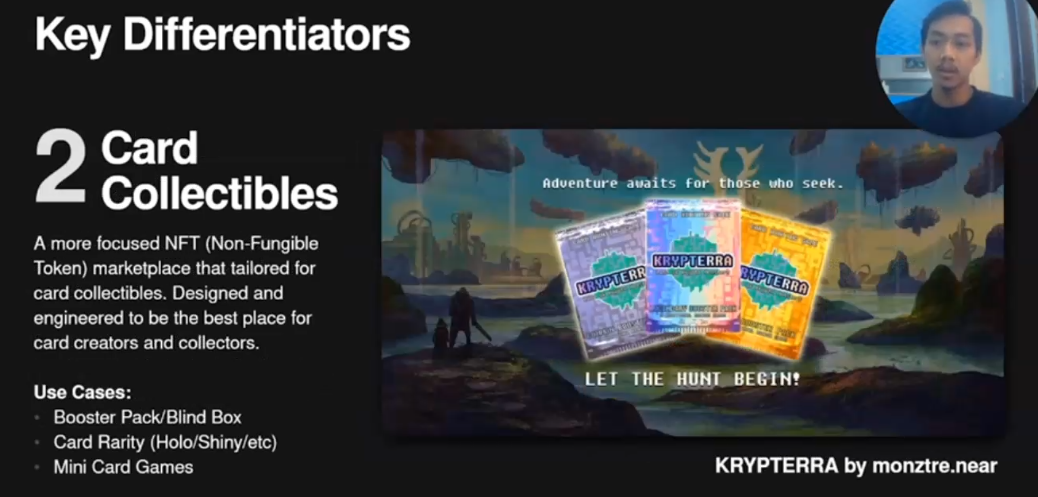 So this is examples by one of our artists monstery, he created a monster hunt game called Krypterra, so he bundled up, he wanted to bundle those those monsters into certain booster pack, and if someone boy buys the booster pack he will receive he or she will receive the monster cards.