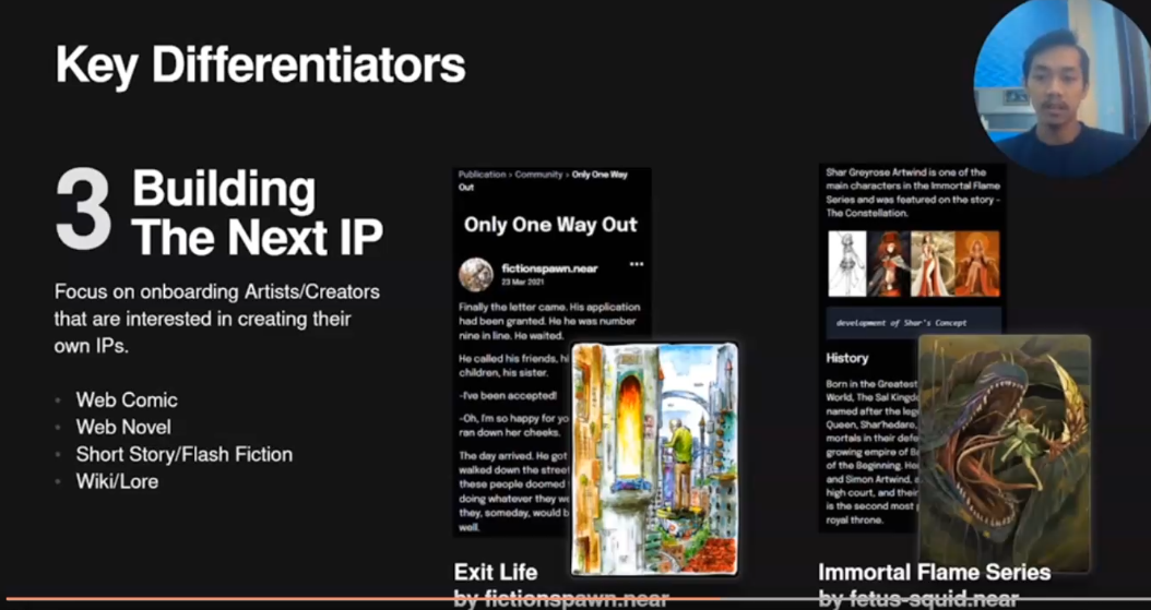 And the last one is building the next IP we focus on onboarding artists or creators that are interested in getting their own IPs, it could be a webcomic web novels, short story or first fiction, or even a wiki or lore.