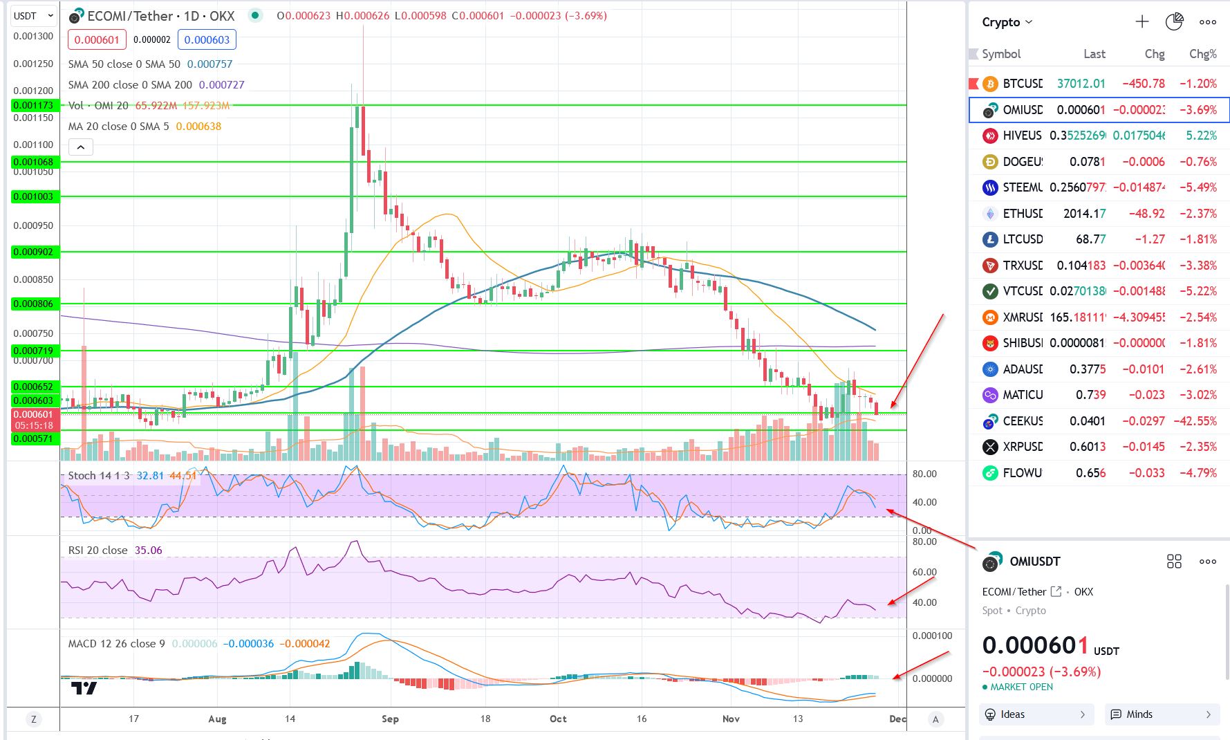 Offgrid Investing - Ecomi (OMI) - Testing Support!hawaiialoha (64)in #nft • 2 years ago Ecomi (OMI) is testing support at 0.00060 on low volume. It is down over -3.6% and the indicators are showing more downside momentum. #omi #veve #investing #bitcoin
