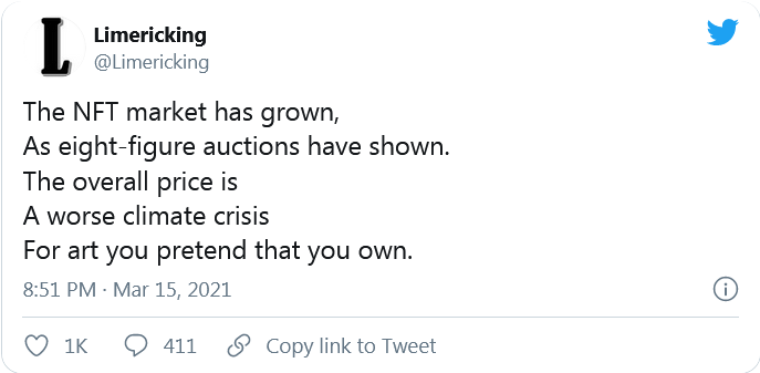 과소비 및 낭비의 위험을 주제로 한 기록이 개발 된 후, NFT의 높은 에너지 요구 사항으로 인해 대기에 극도로 유해한 것으로 확인 된 절차 뒤에 밴드가 이름을 붙인 것은 역전되었습니다.