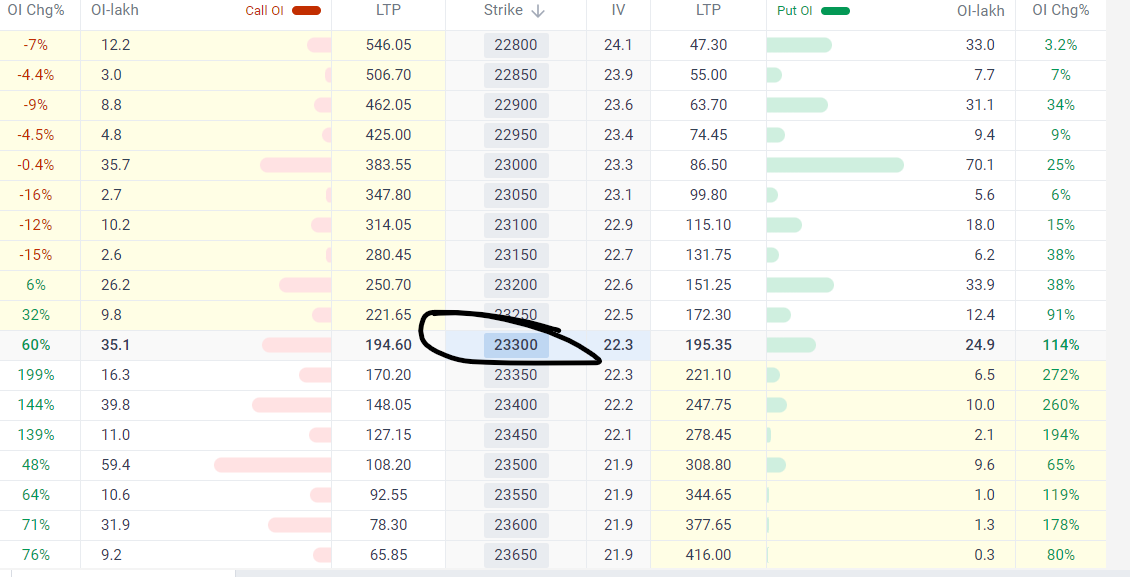Call Options: The highest open interest is observed at the strike price of 23500, followed by 23400 and24000.