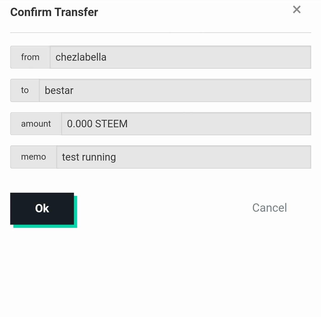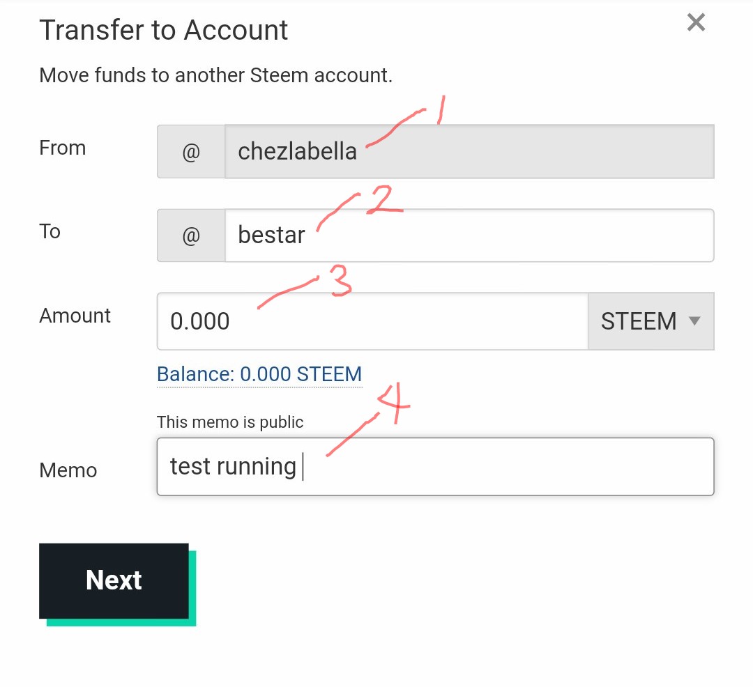 Here the first box is my account, then the second box is where I will input the other Steem account I want to transfer to eg @bestar. The third box is for me to type the desired amount I wish to transfer (sorry unfortunately I have got no steem token there at the moment). The forth is for me to make few notes and then click on Next to proceed.