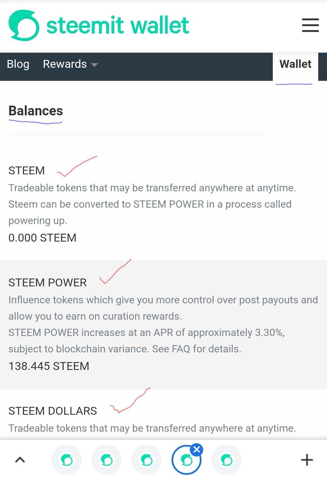 On my Wallet under Balances you will see Steem, Steem Power, Steem Dollar etc. As shown below