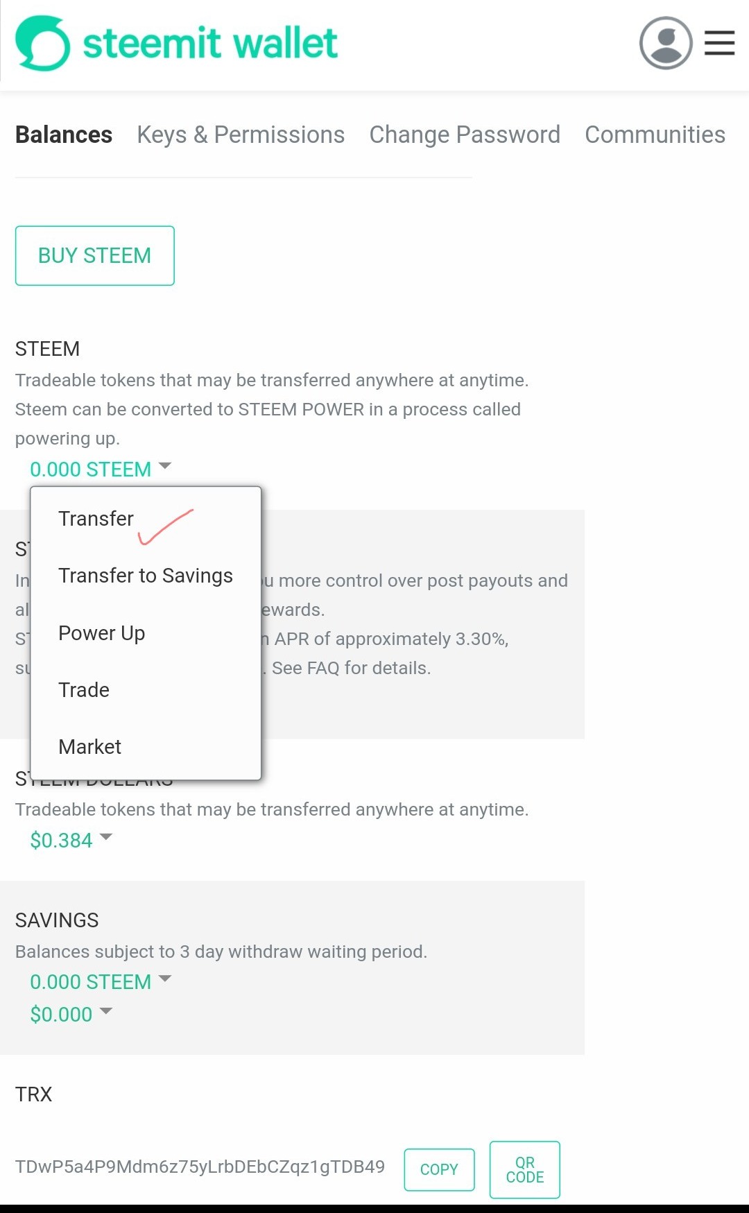 Go to Steem which is transferable as it is said to be in liquid form. Click on the small arrow for a drop-down of information then select 'Transfer'. Please see image A below.