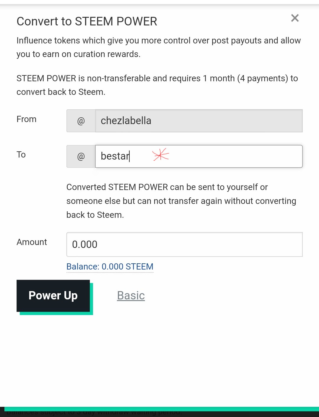 There is also an advanced option whereby you can use your steem token to power up for someone else. In that case the second box bears the username of the beneficiary. Input amount and power up for the person.