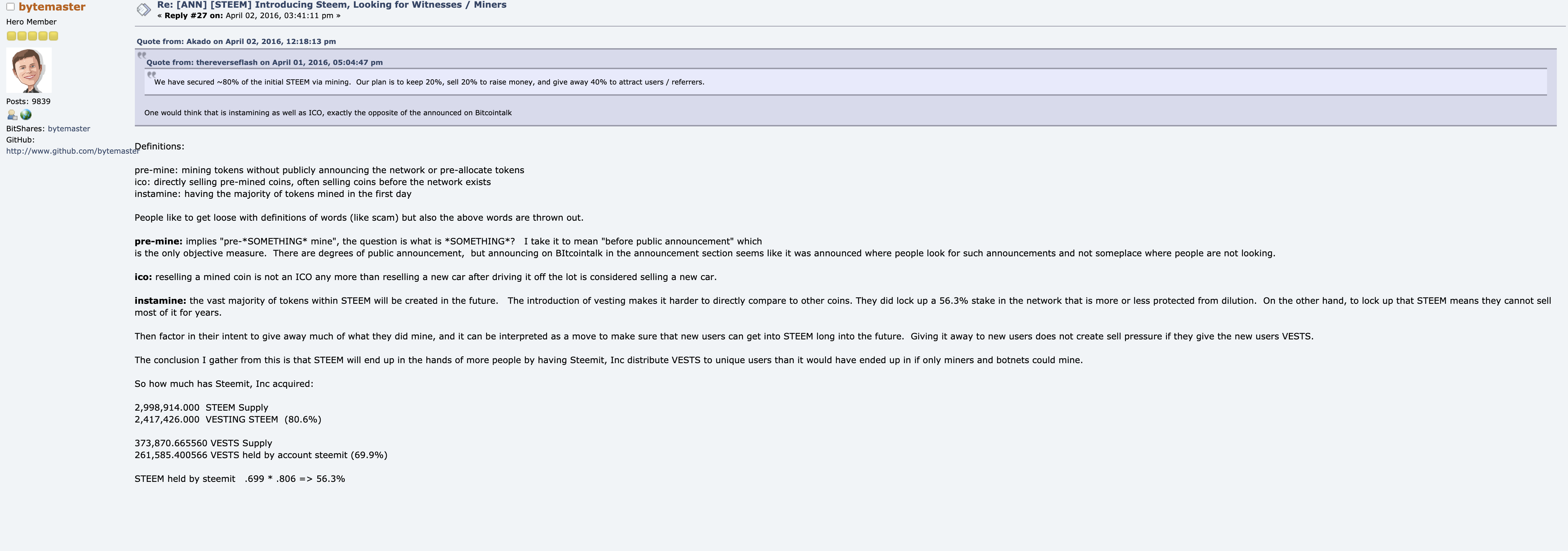 - Dan Larimer's statements on bitcointalk at launch: https://bitsharestalk.org/index.php?topic=22125.45
