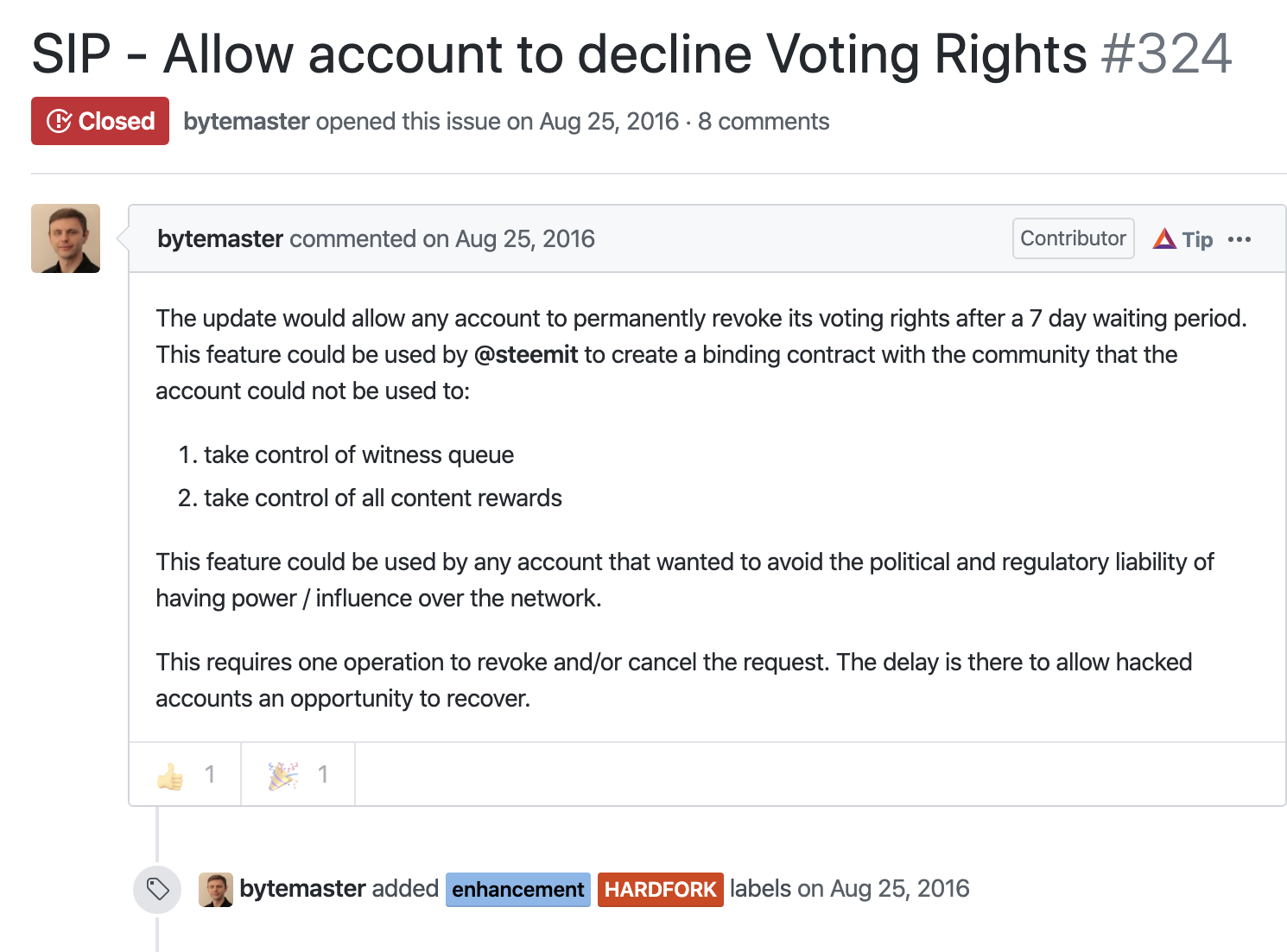 - Github code proposal by Dan proposing a code change to allow code locking of Steemit Inc's stake to non-voting, that was later used by Witnesses in HF22.2: https://github.com/steemit/steem/issues/324