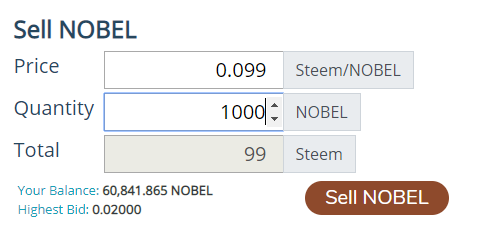 Dort suchst du dir dann einen Wert aus, der knapp unter dem letzten Verkaufsangebot liegt. Momentan ist der NOBEL 0.1 STEEM wert, also wählst du 0.99. Damit bist du diejenige, die als erstes Geld bekommt. Ich muss dann relativ schnell sein (bevor dich jemand unterbietet) und die NOBEL kaufen.