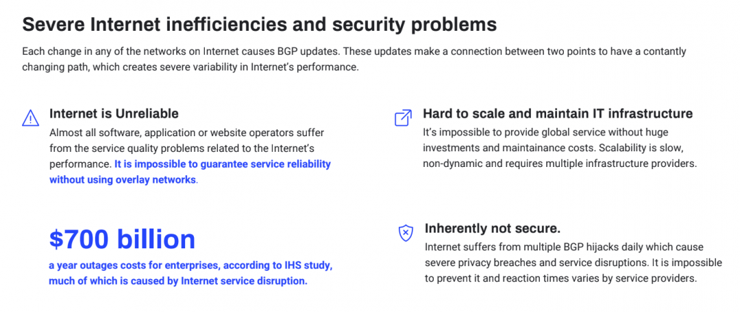BGP a été conçu pour toujours sélectionner le chemin le plus court (chemin de moindre résistance) sans autre considération disponible. C’était simple et efficace. Cependant, au fur et à mesure que la taille et la complexité d’Internet augmentaient, le plus court chemin choisi devenait trop saturé, ce qui entraînait diverses inefficiences. Avec une sécurité limitée, l’imprévisibilité et le manque de fiabilité, les performances Internet actuelles sont sous-optimales. Les prises de jonction BGP et la latence constituent une menace constante.