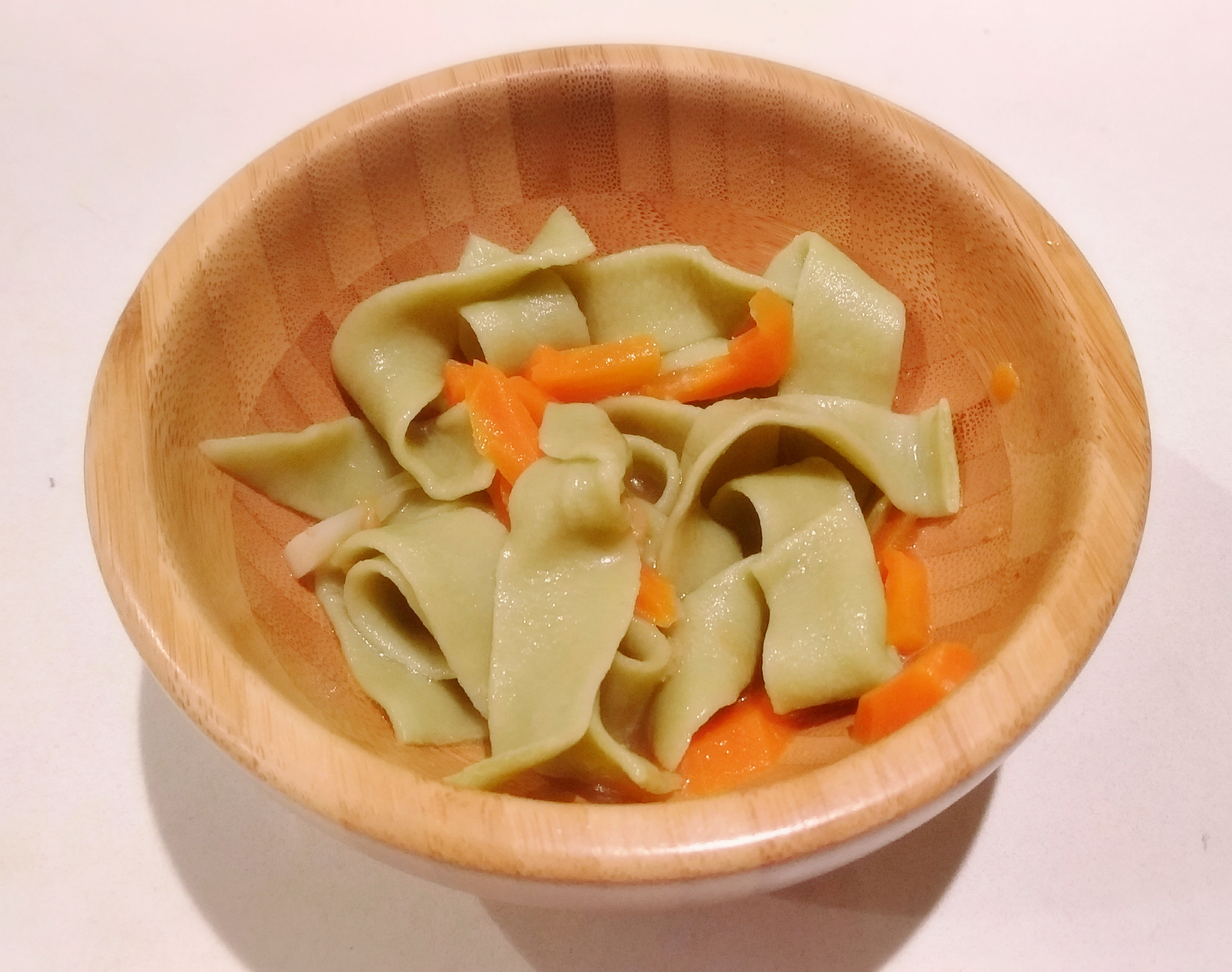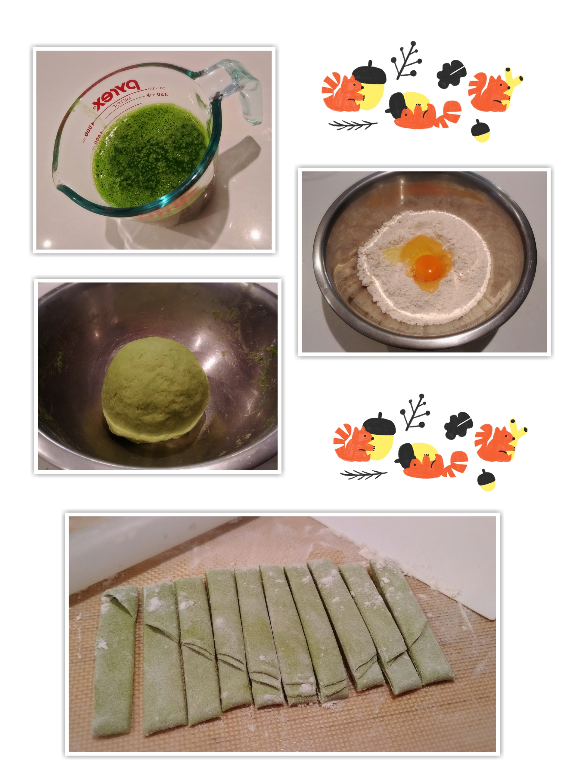 So this afternoon I made some Spinach egg noodles, you can make them without the egg, but I put it in for some additional nutrients. I didn't measure my ingredients, I just kneaded everything together. It was a bit tricky to make them, while entertaining Prince L, but I somehow still managed to get them done just in time for dinner.
