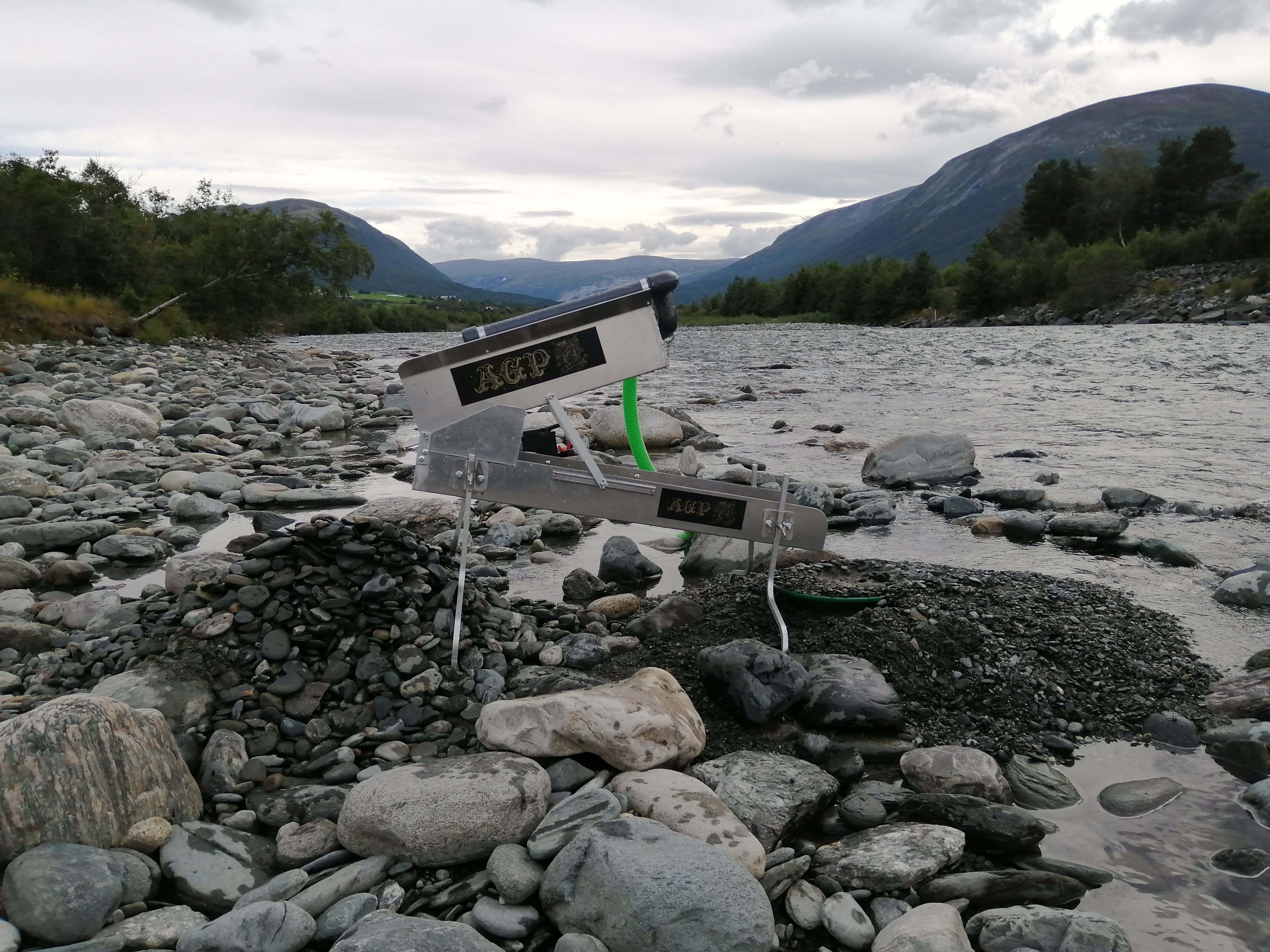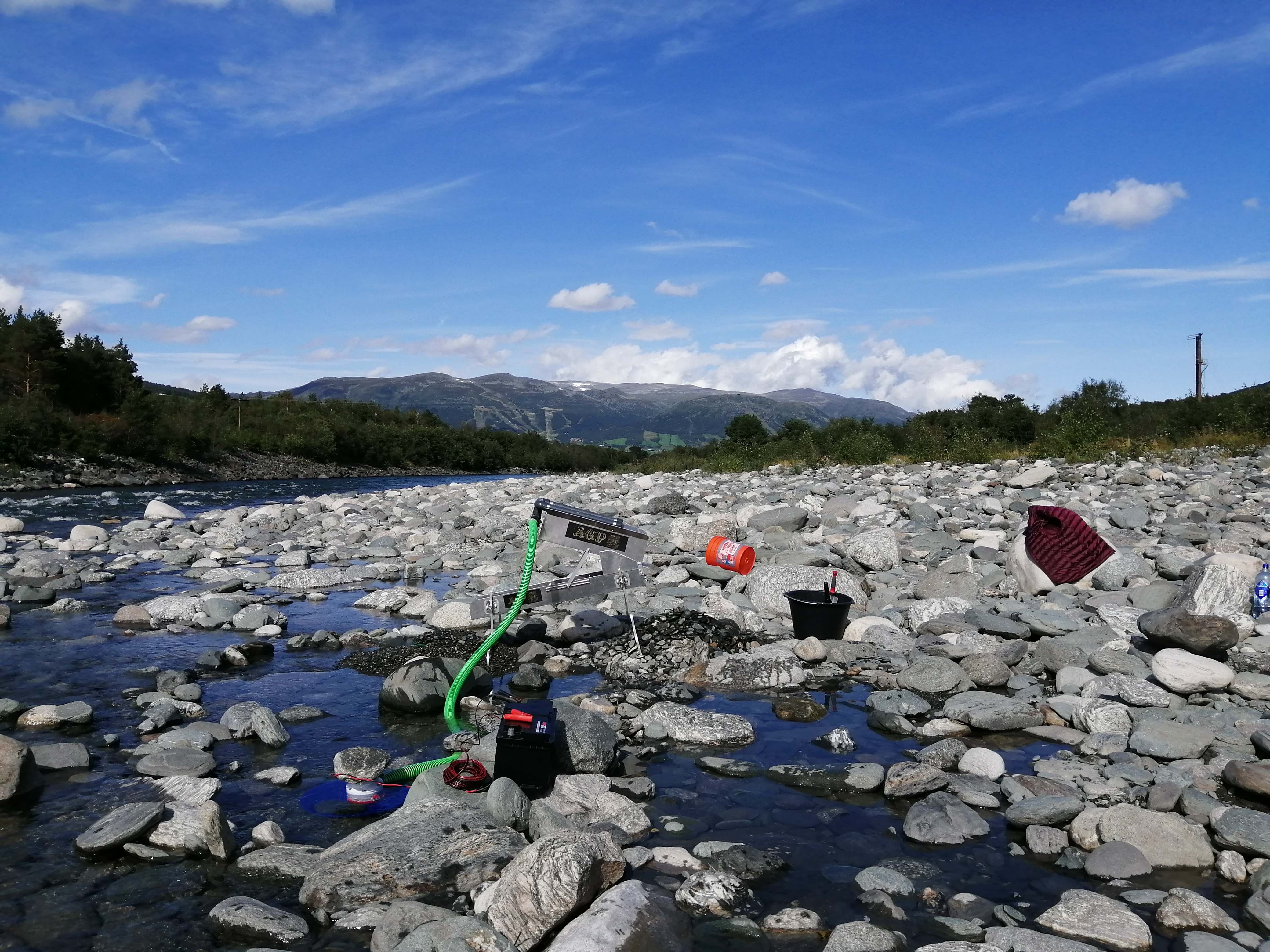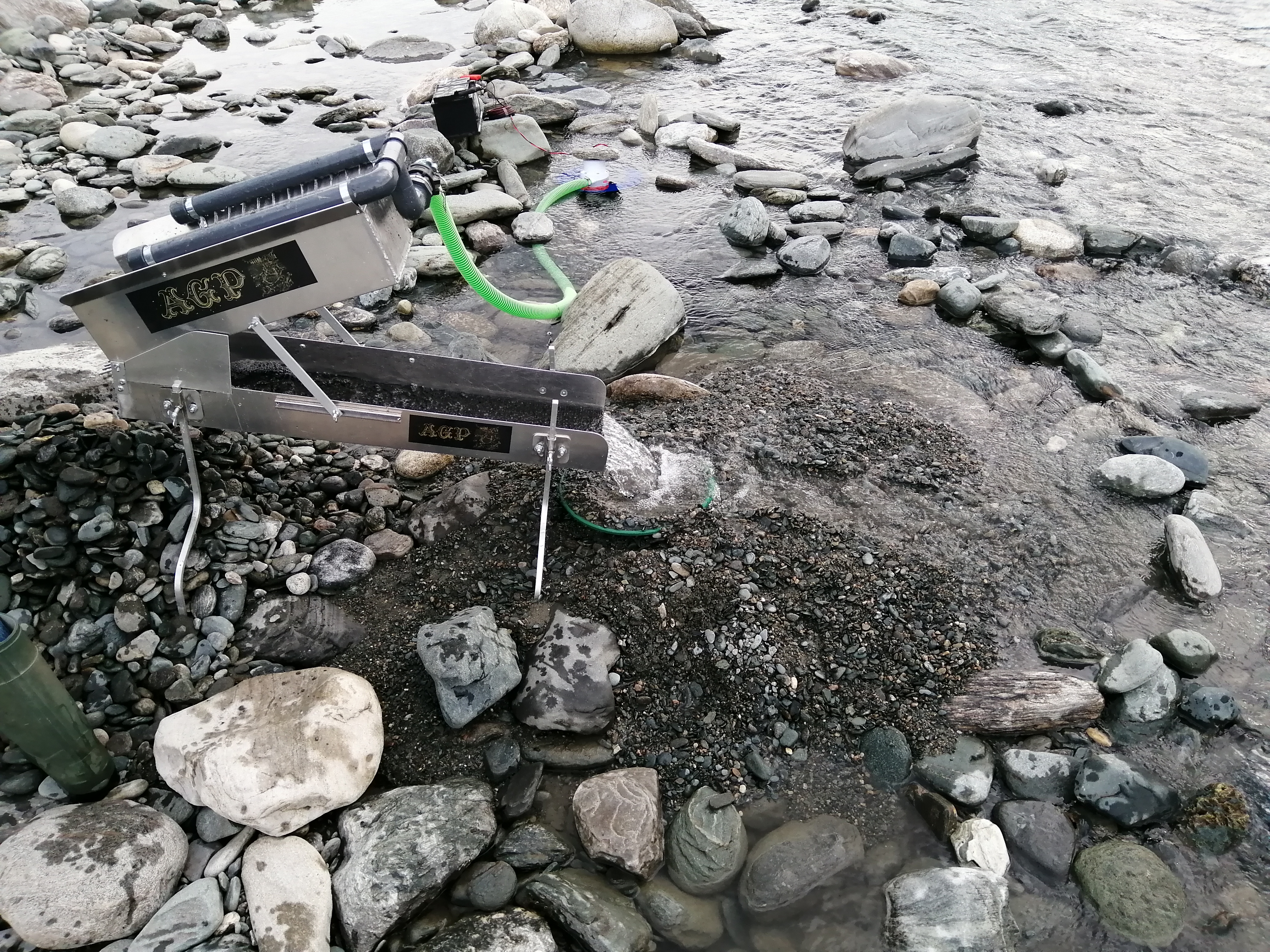 Since the pump run's on battery, it is not very strong, so we had to set it up directly at the river.
