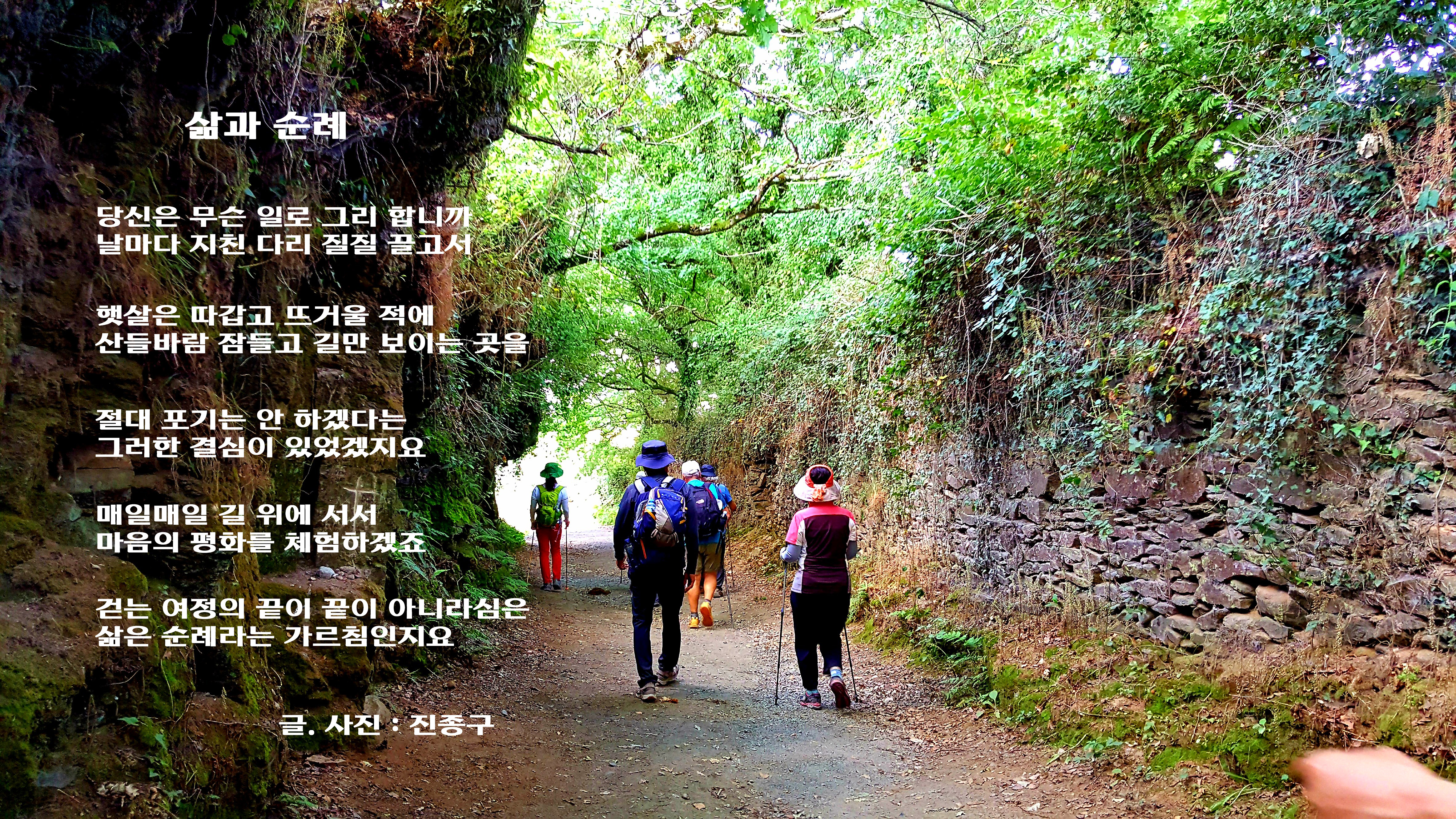 Poem/ 삶과 순례templar-kr (60)adminin NOTICE & AutoVoting • 5 years ago 삶과 순례 당신은 무슨 일로 그리 합니까 날마다 지친 다리 질질 끌고서 햇살은 따갑고 뜨거울 적에 산들바람 잠들고 길만 보이는 곳을 절대 포기는 안 하겠다는 그러한 결심이 있었겠지요 매일매일 길 위에 서서 마음의 평화를 체험하겠죠 걷는 여정의 끝이 끝이 아니라심은 삶은 순례라는 가르침인지요 #trekking-landscape #kr #aaa #zzan #dblog #liv #photo