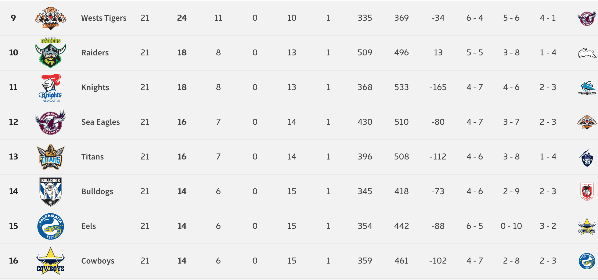 With only a handful of games left before finals it looks like the top four are solid. Will the broncos hold the top 8 or can the Tigers knock them off? Is there maybe danger for the shark and warrior??