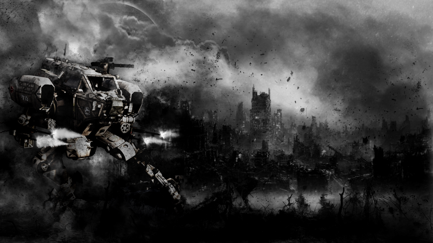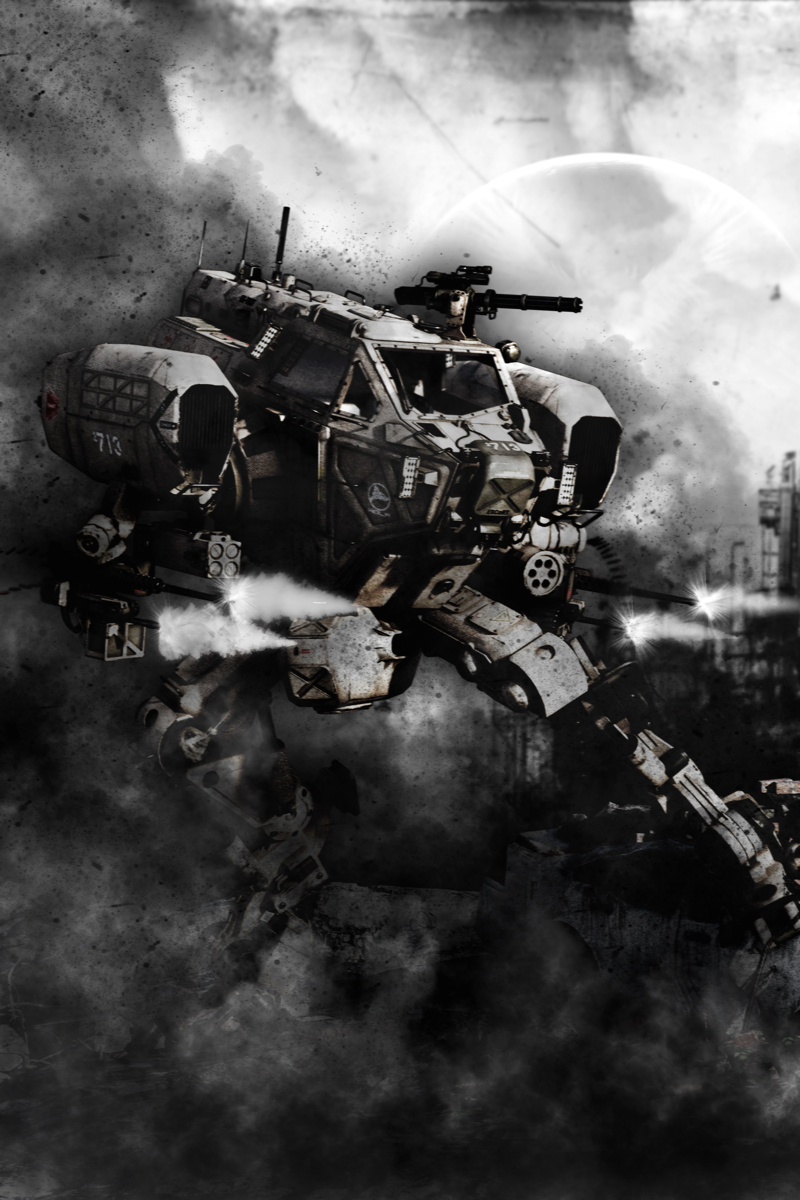 As you can see, the main render wasn't bad, but too clean and bright. So, I decided to use a combination of image layers to create a dark, black and white style image with just a hint of colour. I also created a dark silhouette of the render and blurred with gaussian to create a dark outline behind the Mech that would serve to pop the image from the background.