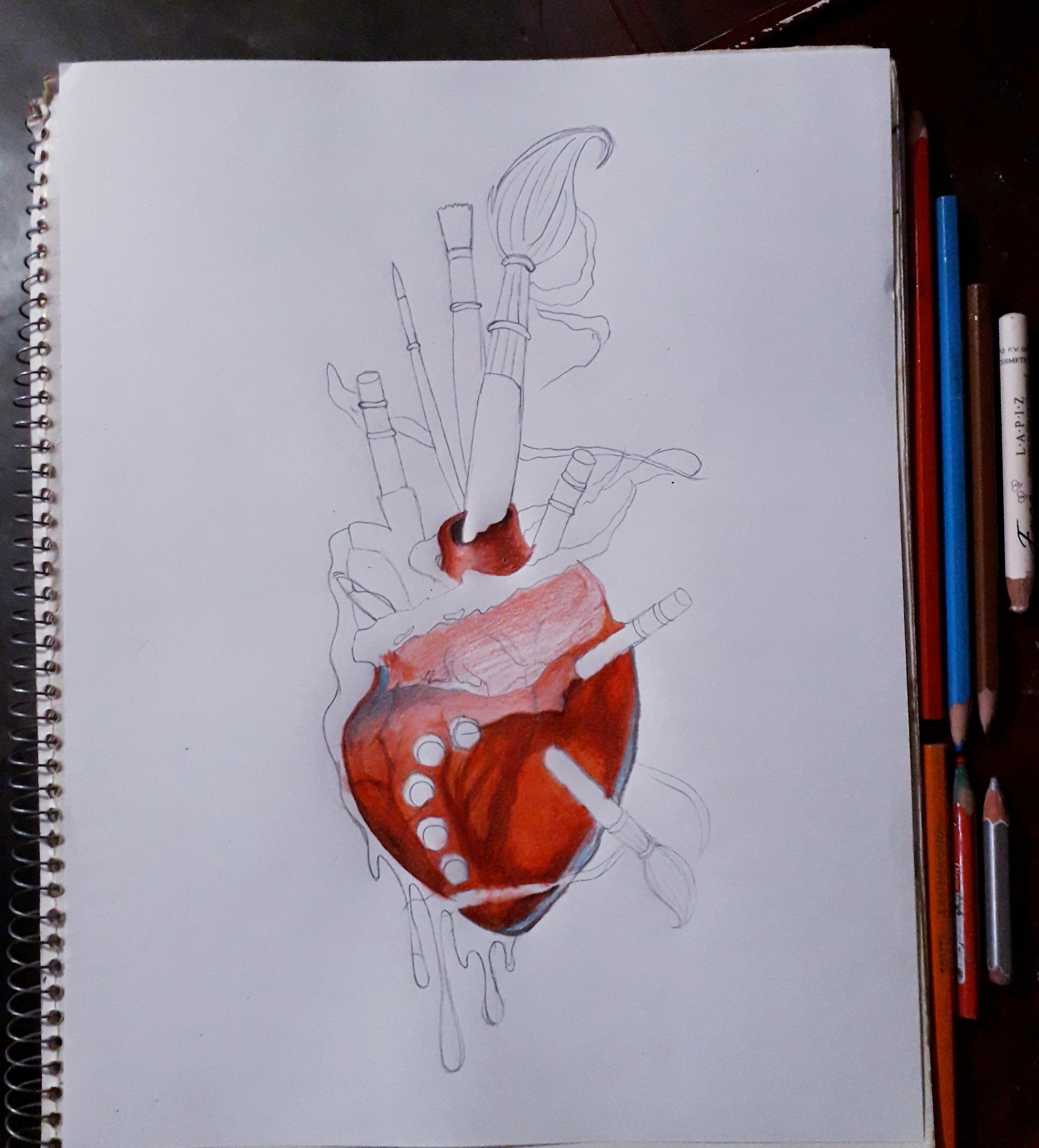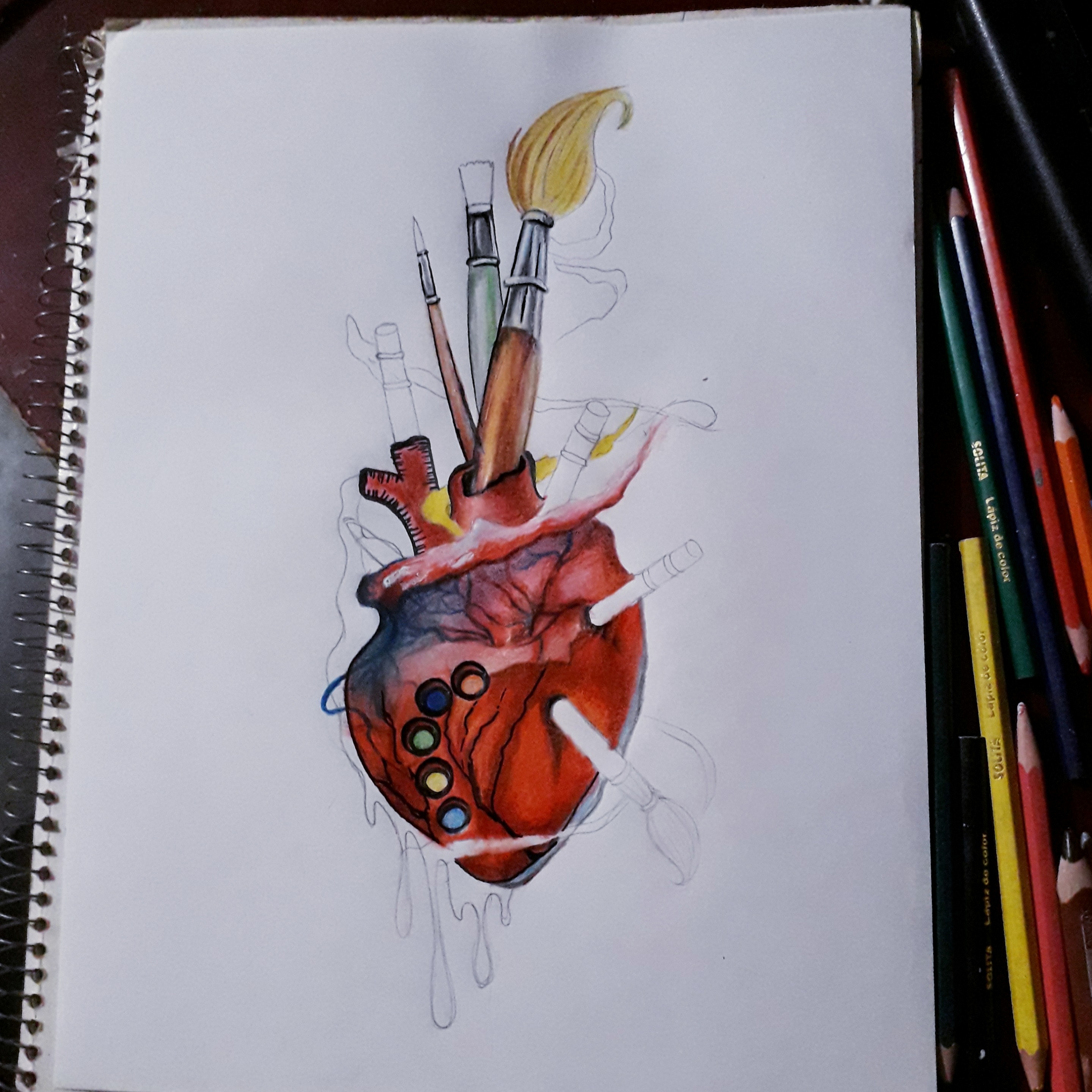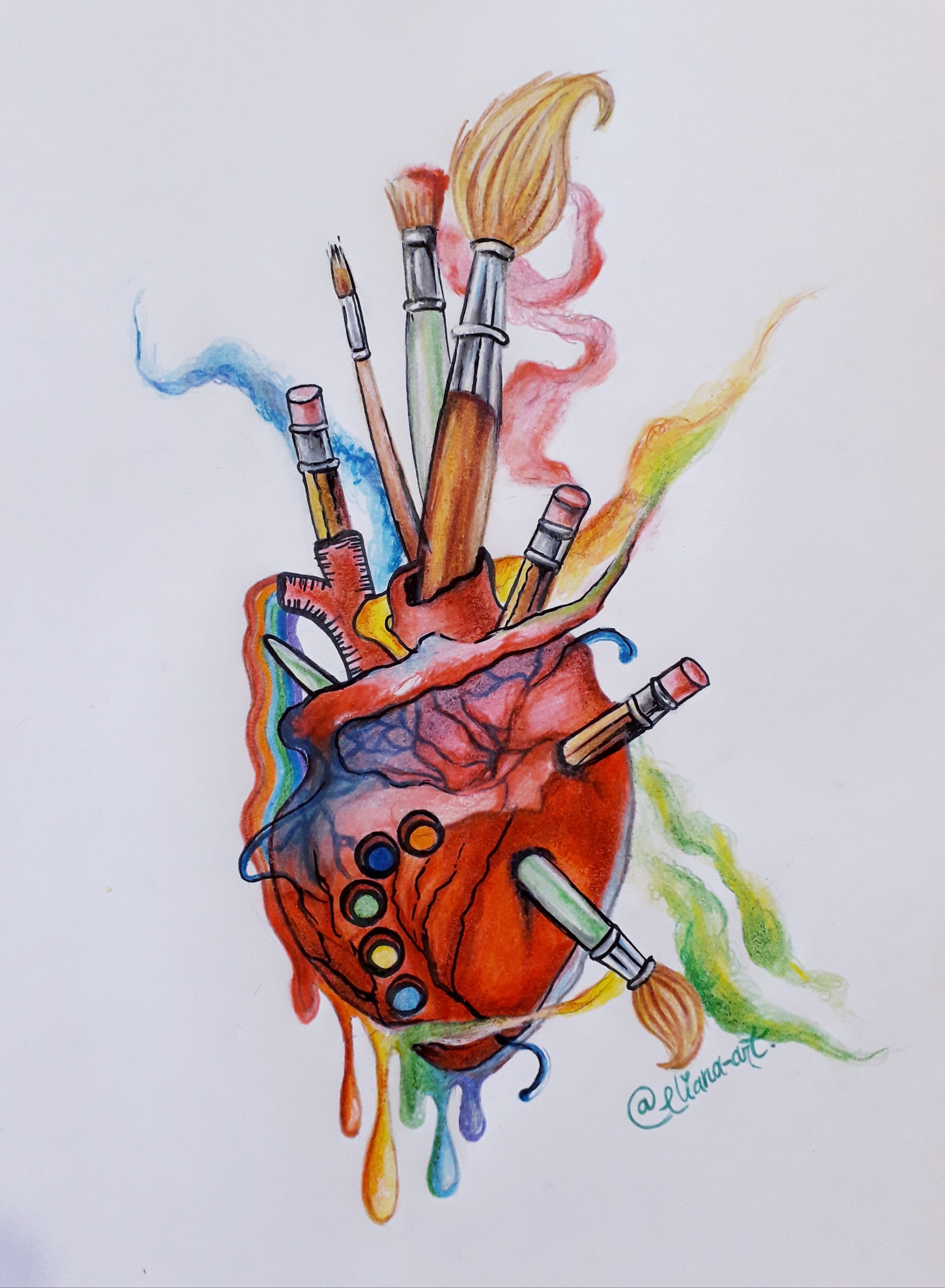 I love the visual of the pencils and paint brushes sticking out from the heart. It gives an impression of the art from the heart :) Your colouring is amazing. I like the different colours added to the paint drips and valves on the heart. It gives a very artistic impression to the meaning of this piece of work.