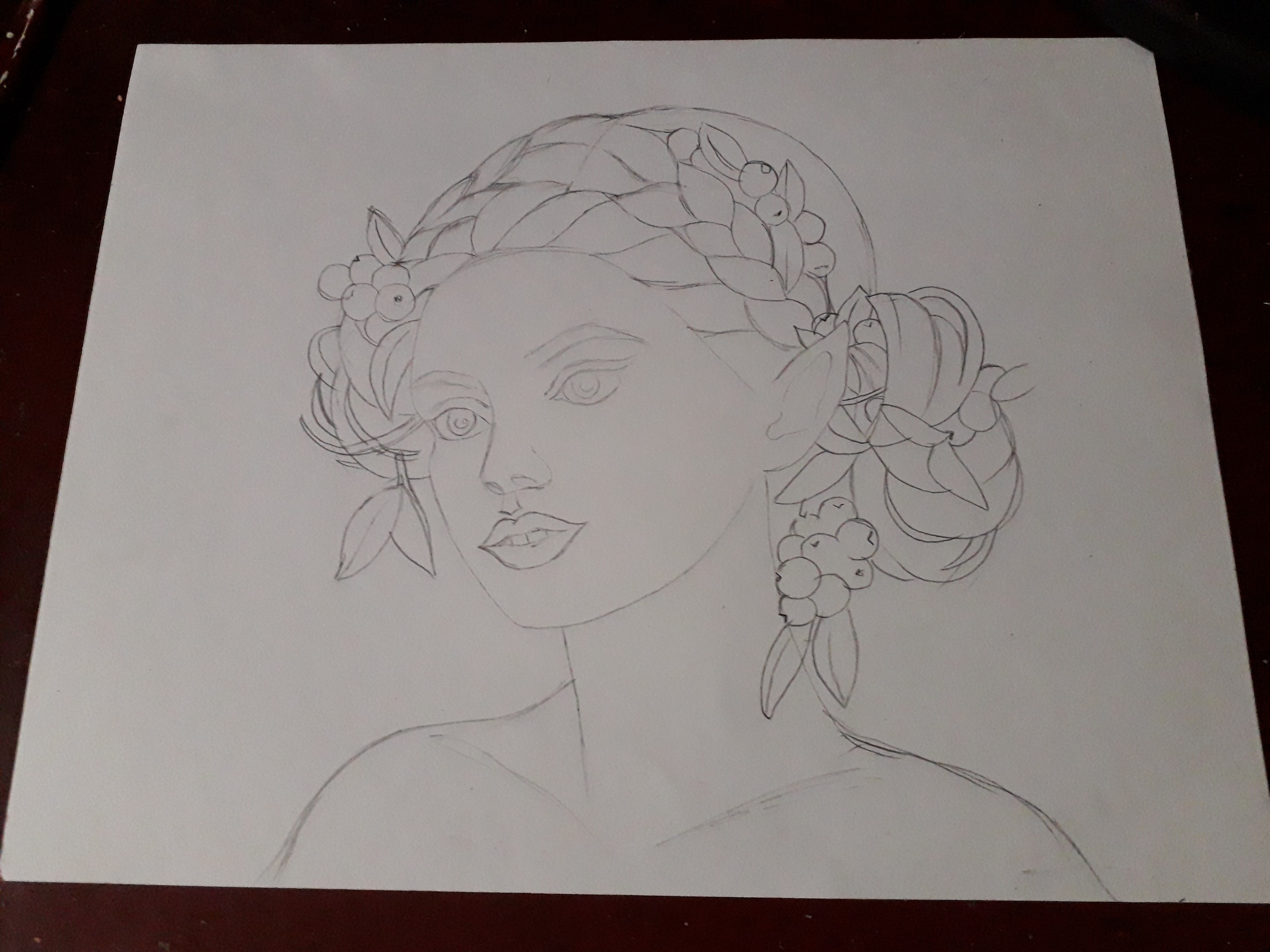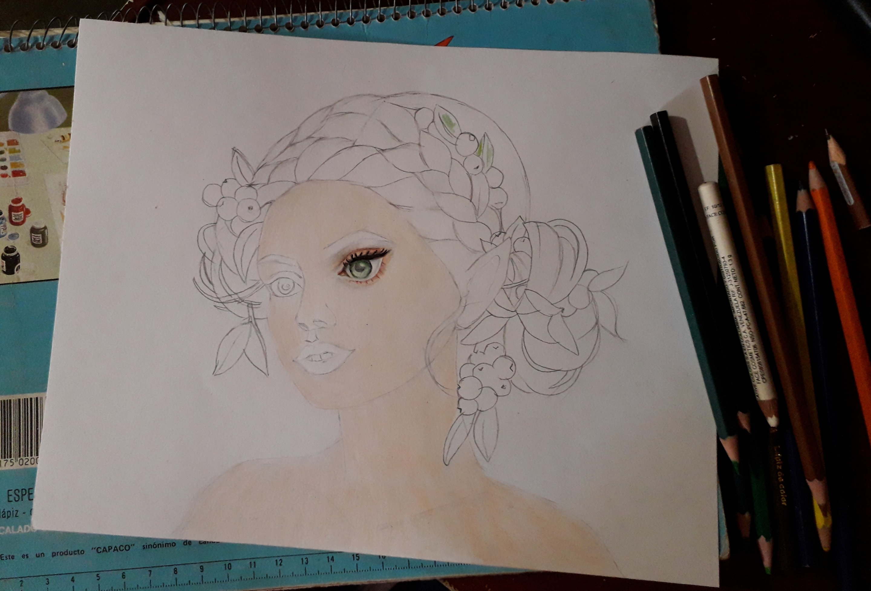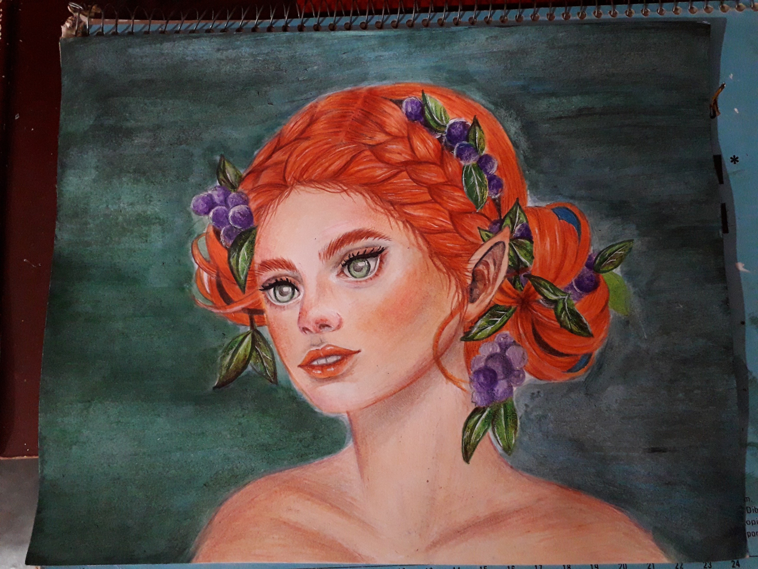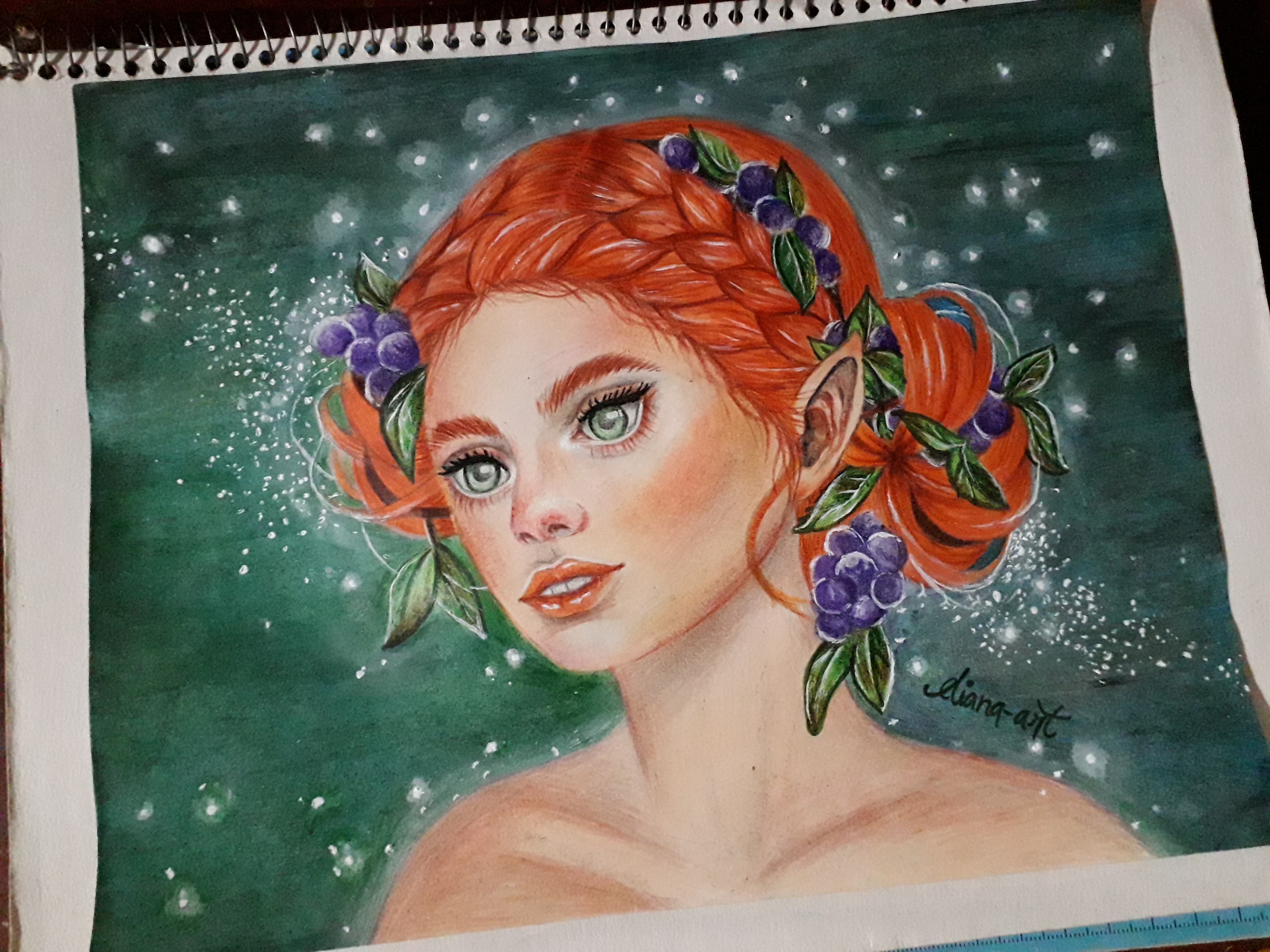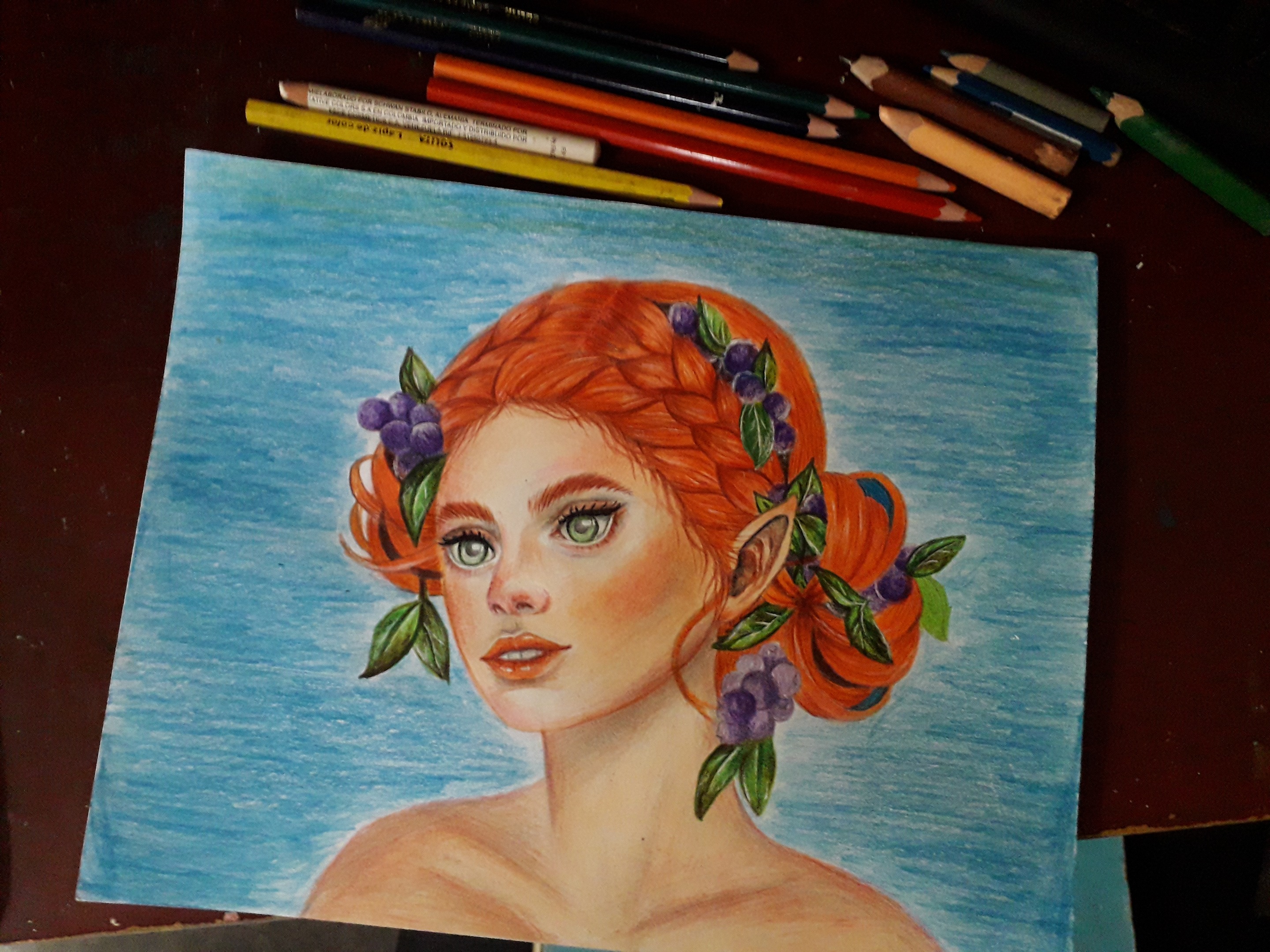 In this occasion I dedicated myself to create this beautiful and magical painting, as I mentioned before, one of the things I like most and enjoy painting are the faces of women, but to give a touch of fantasy that I like so much, I made a kind of fairy with grapes that come out of their beautiful red hair. I used colored pencils and some paintings as well to create my drawing. I hope you like it!