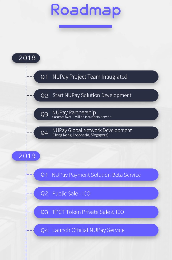 TPCT will serve as fiat money for NUPay platform and will be used to carry out most monetary obligations in the platform.