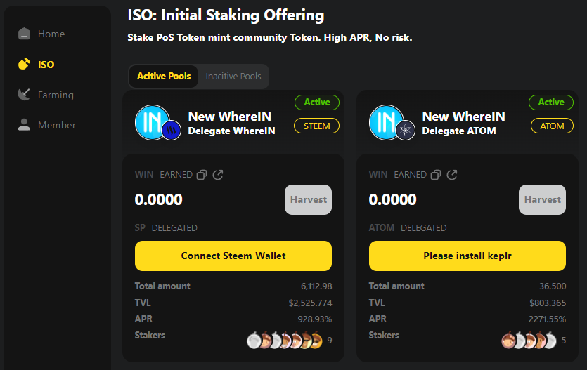PoS Token holders such as ATOM and STEEM Power can get WhereIN's new native token $WIN by block by staking SP/ATOM to @wherein.dao