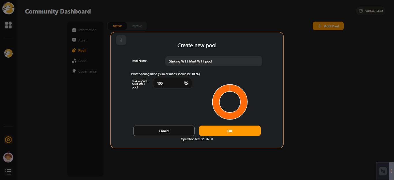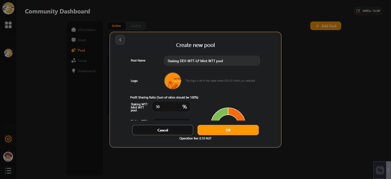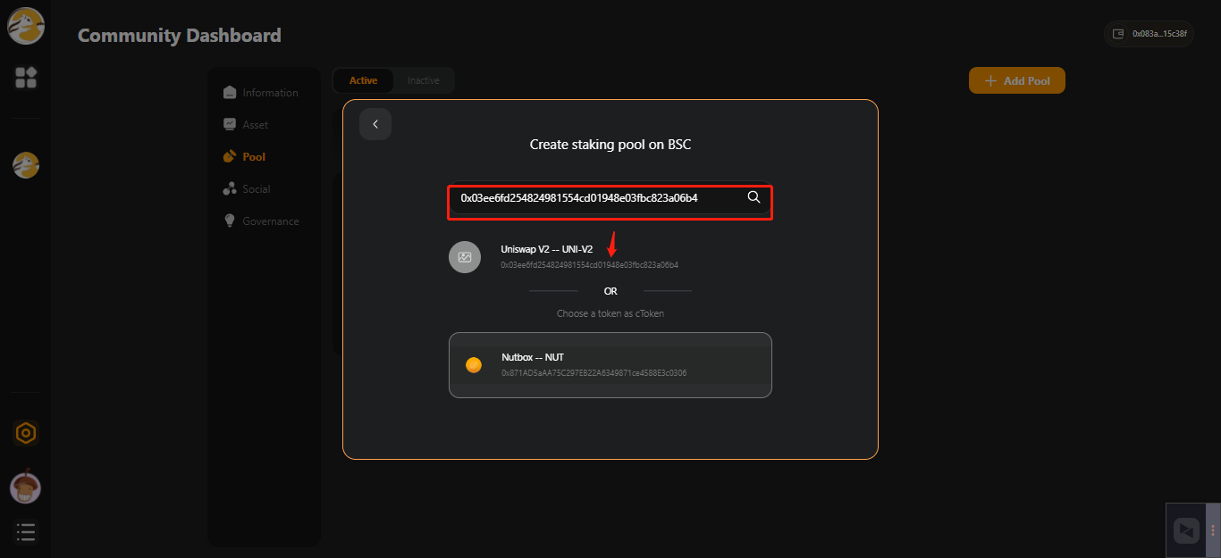 Fill in the LP Token contract to provide liquidity for the community token into the box and select. Fill in the name of the liquidity mining pool, define the fraction of community token to be allocated into that mining pool, click「OK」.