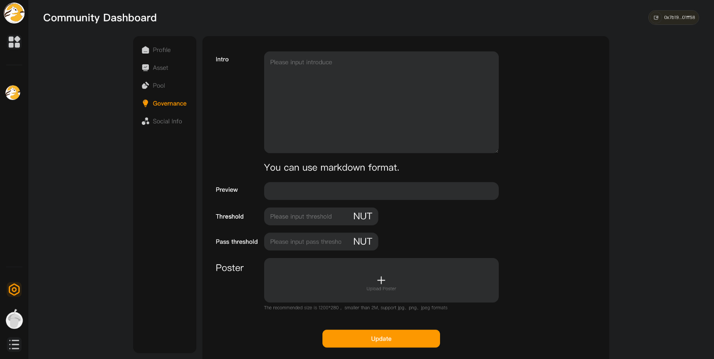 In the configure – Governance interface, fill in introduction for the community proposal system, the lowest amount of token held required to submit a proposal, the amount of token to pass a proposal voting, upload the cover image for the proposal system, then click「Update」and you’re done.