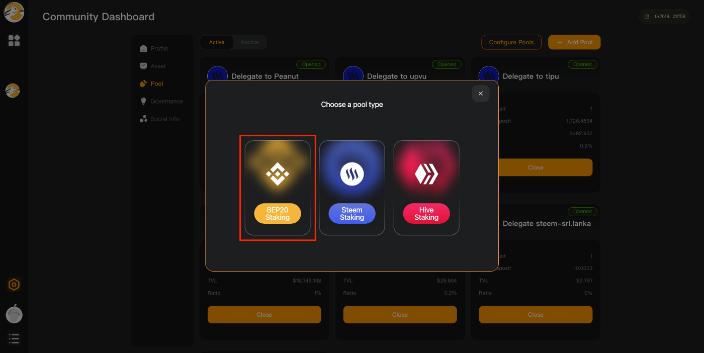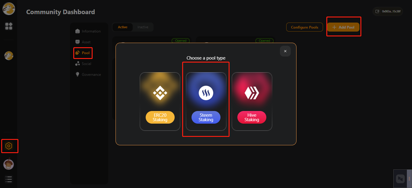 In the Configure – Pool interface, click「Add Pool」, select Steem Staking or Hive Staking, then configure according to the hints.