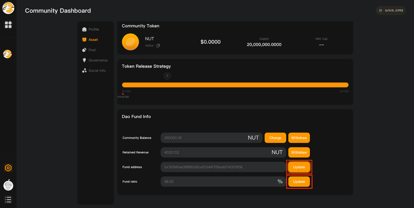 In the community configuration interface, click「Asset」, configure the fraction of minted community token to be allocated into the DAO fund account and replace the DAO fund account with a community-controlled multisignature account.