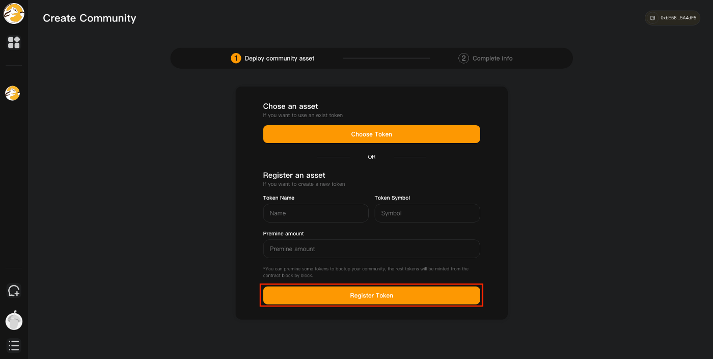 Open Walnut【https://walnut.nutbox.app/】, click「Create New Community」, fill in the community token’s name, token abbreviation, pre-mine amount, then click「Register Token」。