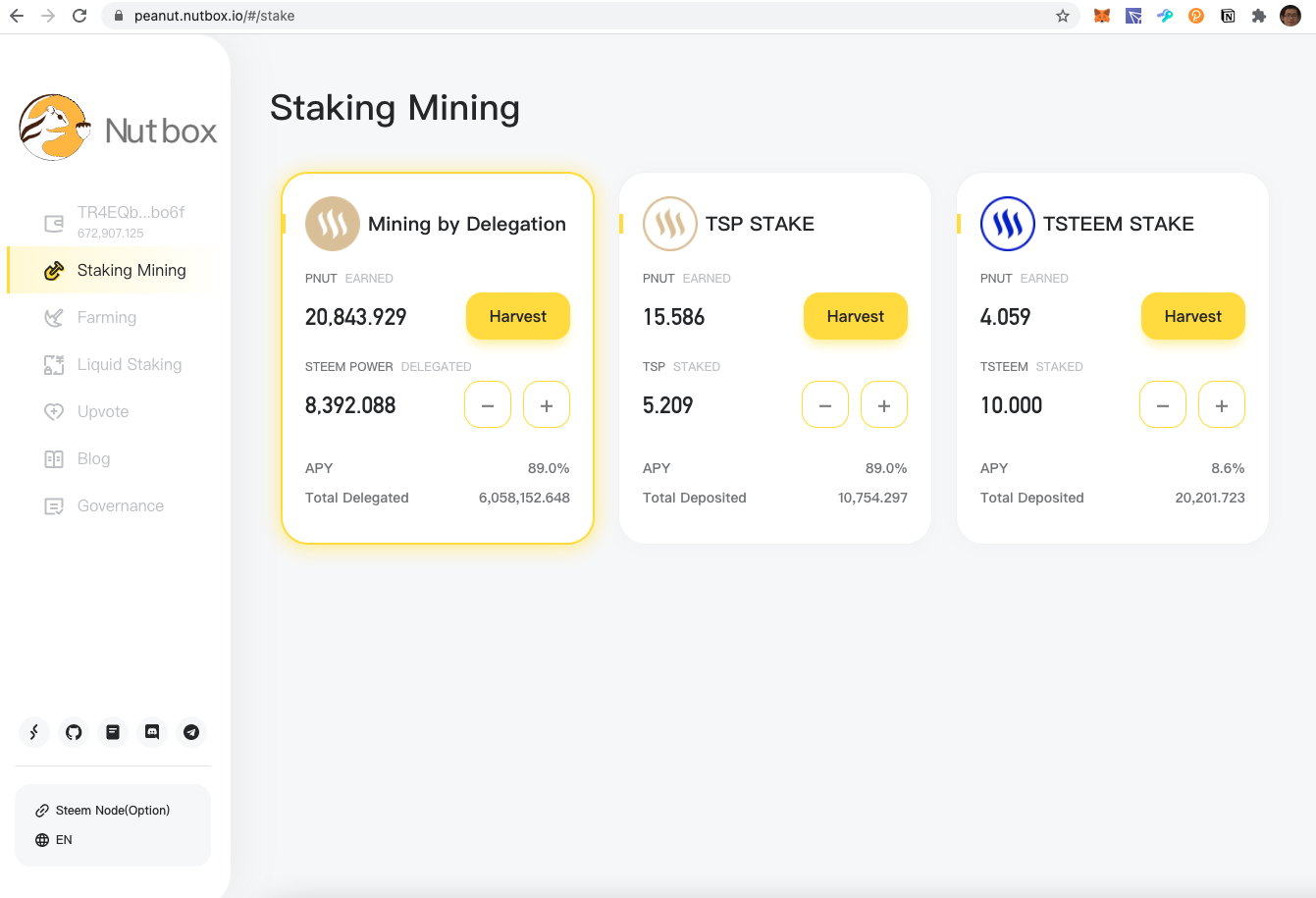 在Nutbox v2揭晓以前,我们重新梳理了Peanut与Nutbox v2的关系。现在大家可以点击进入Nutbox官网(nutbox.io),轻点主页的「Try Peanut」参与Peanut的代理SP挖PNUT。Peanut社区成员亦可直接通过「https://peanut.nutbox.io/」进入到Peanut挖矿页面。