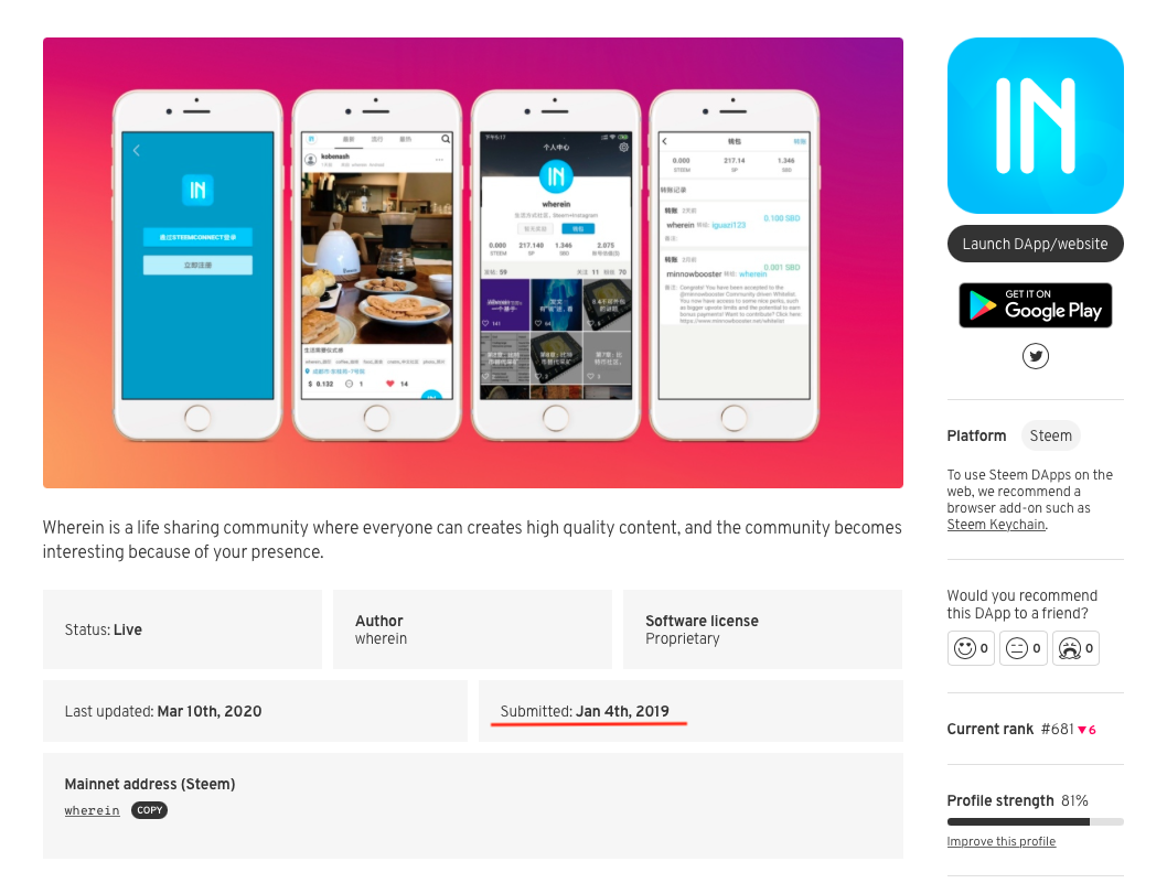 Two years have passed, and WhereIN DApp has walked through the valley together with the blockchain up to this day, becoming the mainstream global social public chain No.07. Meanwhile, WhereIN has also received the support of 1 million SP from steemit.inc, which incubated Nutbox.
