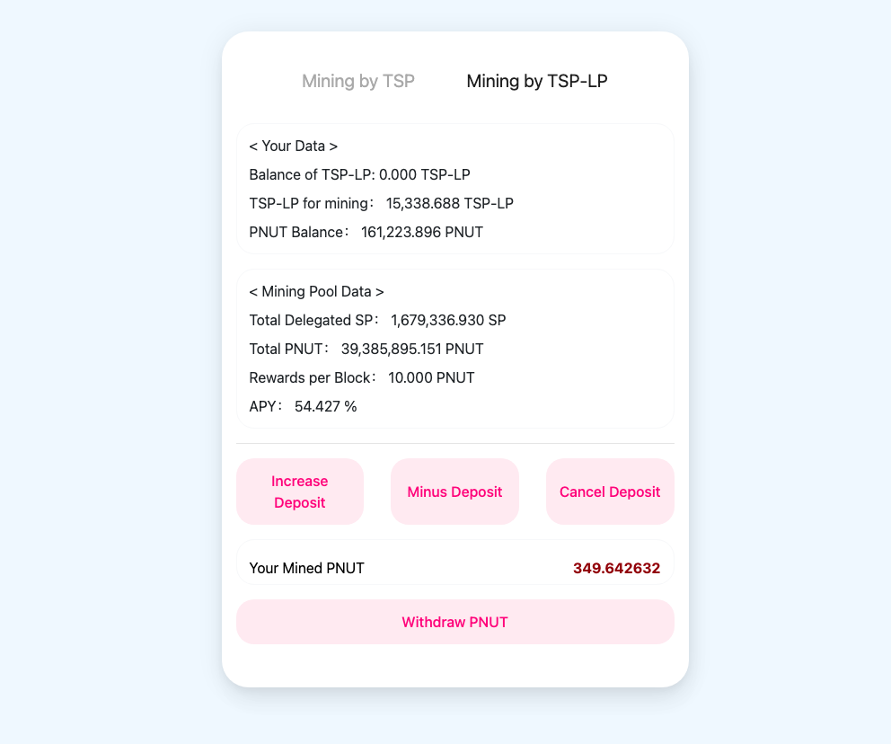 Users will get 1 TSP upon depositing 1 STEEM to nutbox.tsp. nutbox.tsp will power up the 1 STEEM into SP, and then proxy it to nutbox.mine to participate in Nutbox's proxy PNUT mining.