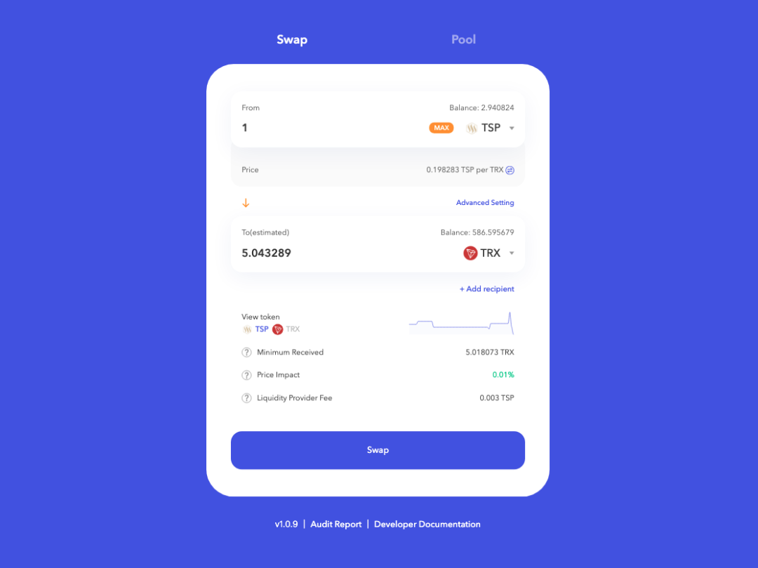 Through the TSP asset, it activates the SP's liquidity while retaining its income. TSP can be launched on the lending platform, mortgage TSP to lend USDT or DAI with low transaction fees, and obtain stable assets at low cost while receiving staking income. TSP can also provide liquidity for TSP-TRX trading pairs on JustSwap, and users will receive staking income and transaction fees simultaneously.