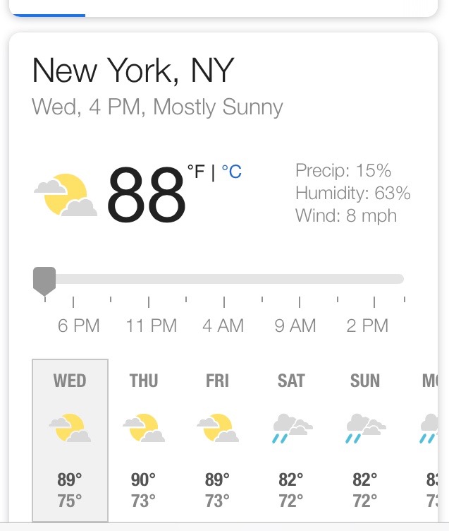 The New York Weather is a nice, hot, 88 Degrees Fahrenheit in New York today. That's what the weather app says anyway, we don't really know as we are online and all over the world.