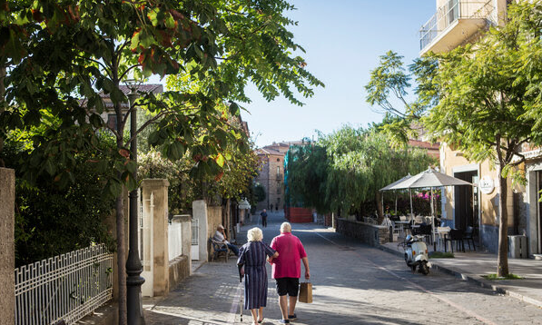 이탈리아 Acciaroli의 커플. 많은 이탈리아 도시의 인구는 극적으로 고령화되고 감소했습니다.