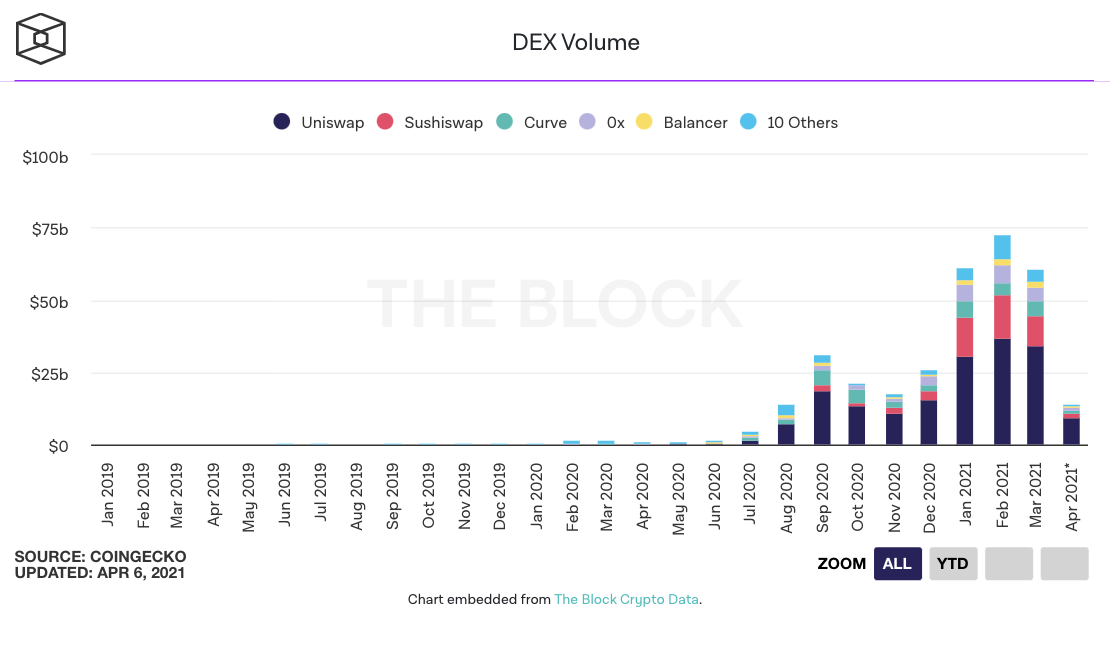 The Block이 수집 한 데이터에 따르면 탈 중앙화 거래소 (DEX)는 3 월에 총 월간 총액이 673 억 2 천만 달러로 전월보다 8.12 % 감소했습니다.