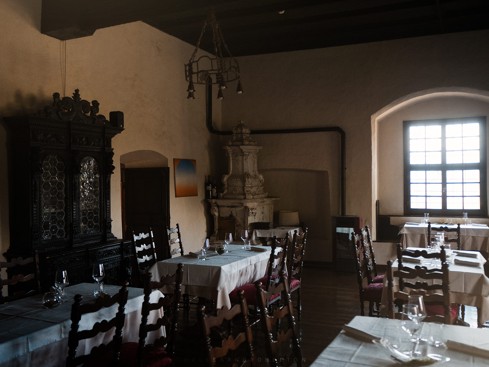 Two rooms adjacent to the bar had the tables set for dinner and at the corners there were some really interesting large cast-iron stoves, I had never seen such beautiful ones.