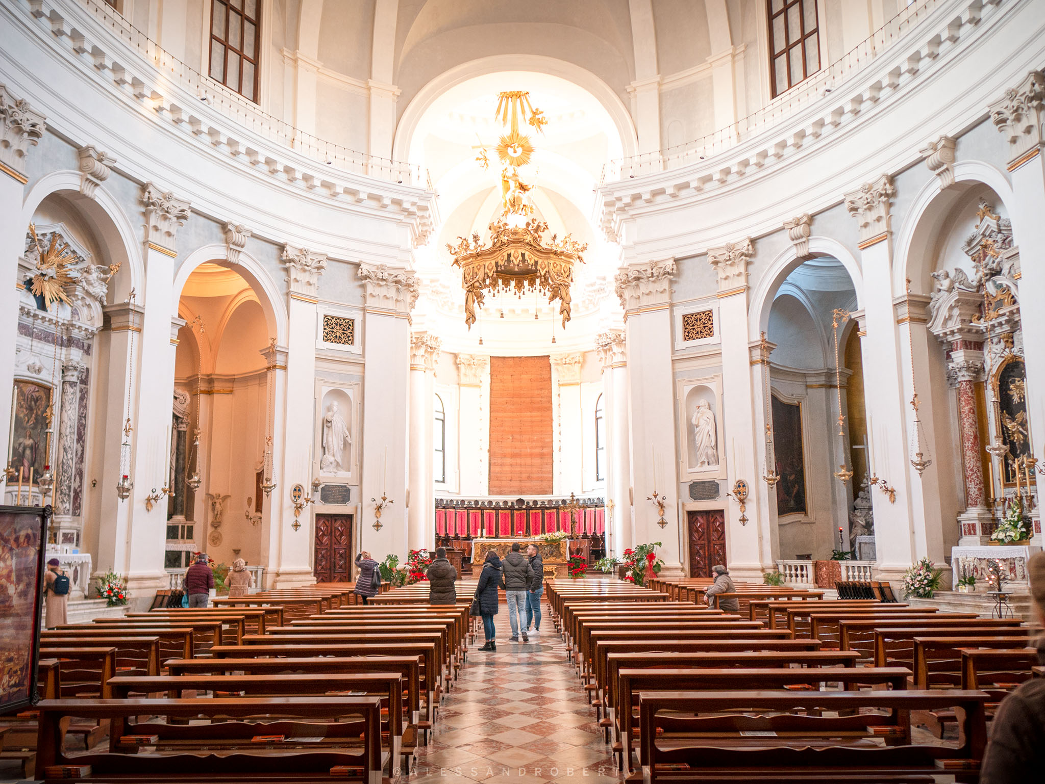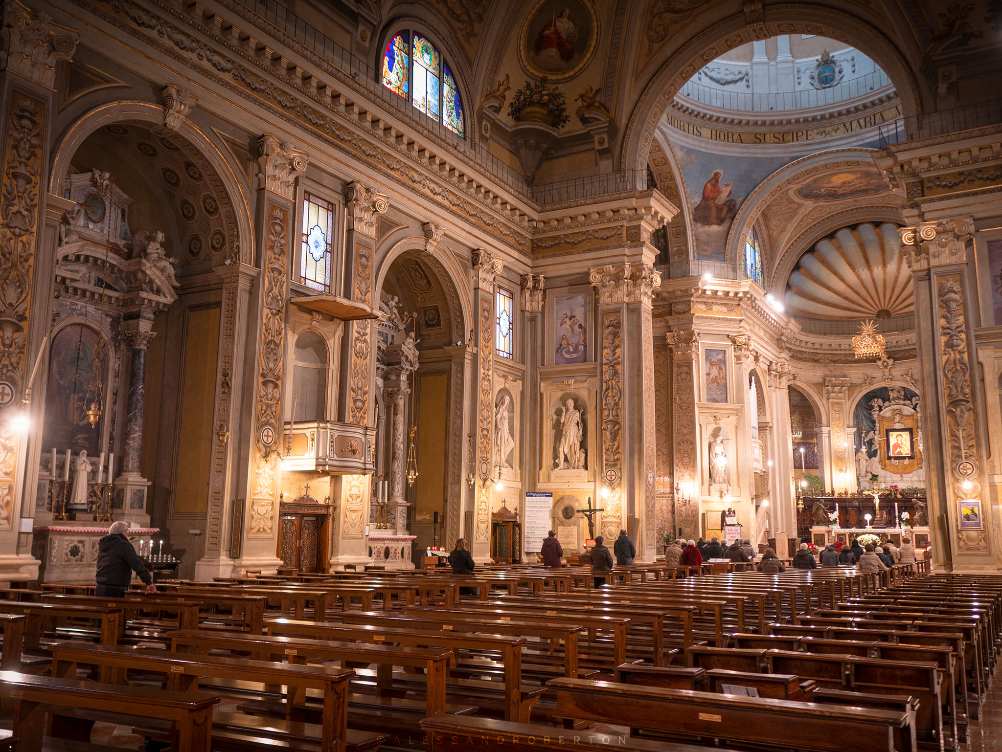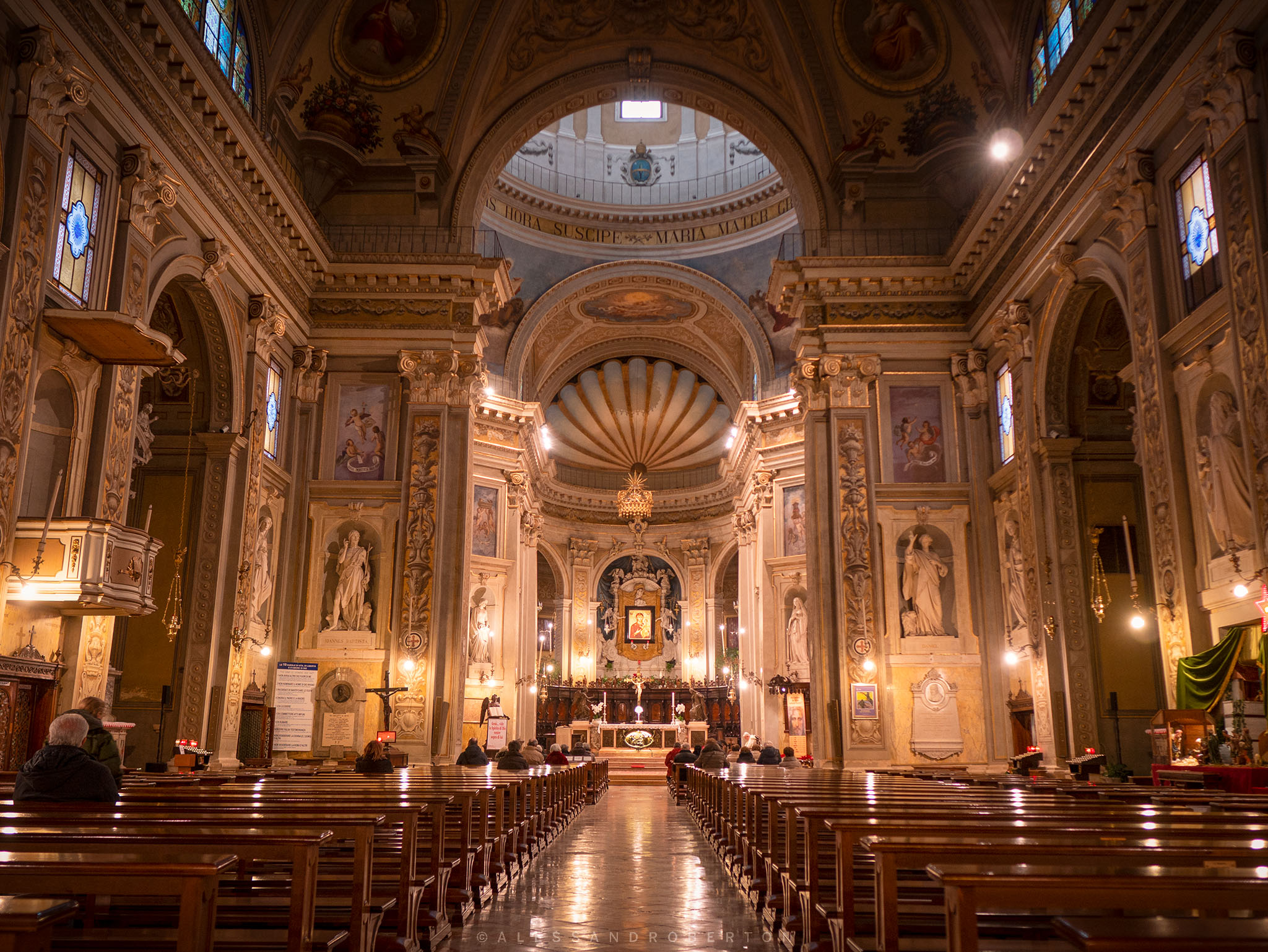L'ambiente è molto ampio e armonico con il ballatoio che sovrasta le nicchie laterali e che conduce l'occhio verso l'altare.